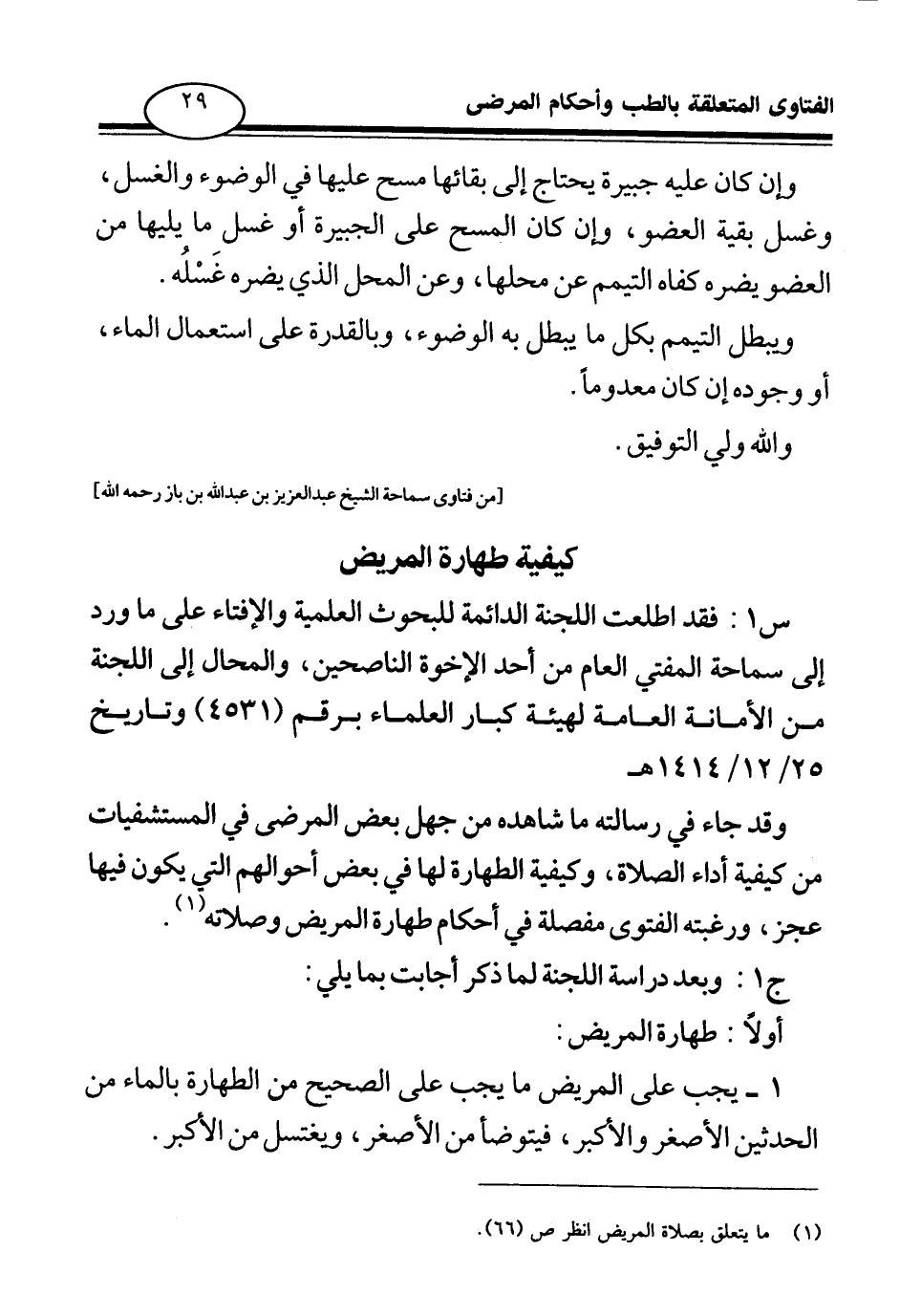 1 - يجب على المريض ما يجب على الصحيح من الطهارة بالماء من الحدثين الأصغر والأكبر، فيتوضأ من الأصغر ويغتسل من الأكبر.