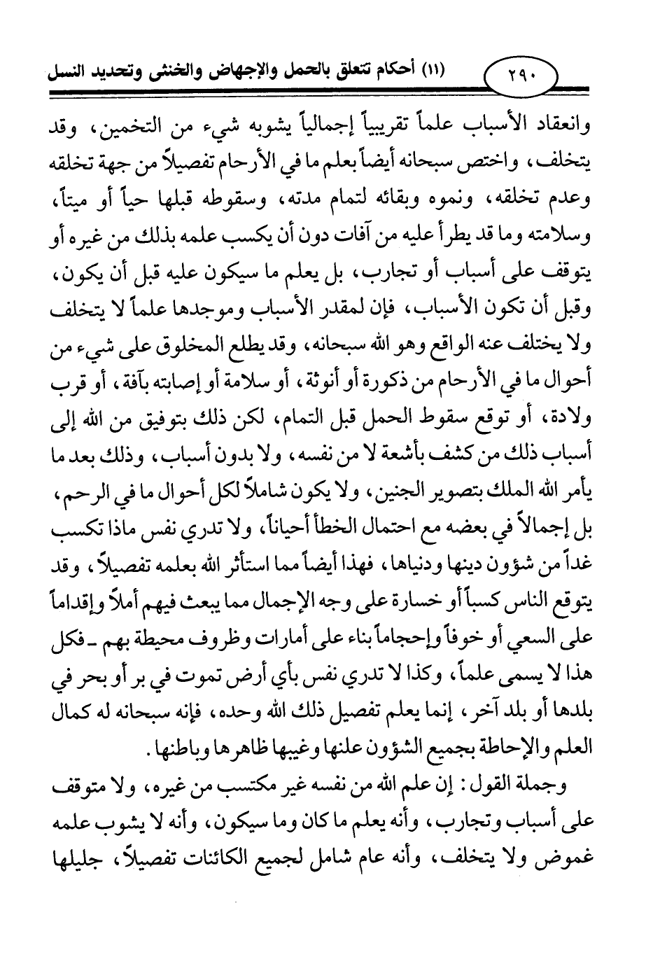 وانعقاد الأسباب علما تقريبيا إجماليا يشوبه شيء من التخمين وقد يتخلف، واختص سبحانه أيضا بعلم ما في الأرحام تفصيلا من جهة تخلقه وعدم تخلقه ونموه وبقائه لتمام مدته وسقوطه قبلها حيا أو ميتا وسلامته وما قد يطرأ عليه من آفات دون أن يكسب علمه بذلك من غيره أو يتوقف على أسباب أو تجارب، بل يعلم ما سيكون عليه قبل أن يكون وقبل أن تكون الأسباب فإن لمقدر الأسباب وموجدها علما لا يتخلف ولا يختلف عنه الواقع وهو الله سبحانه، وقد يطلع المخلوق على شيء من أحوال ما في الأرحام من ذكورة أو أنوثة أو سلامة أو إصابته بآفة أو قرب ولادة أو توقع سقوط الحمل قبل التمام لكن ذلك بتوفيق من الله إلى أسباب ذلك من كشف بأشعة لا من نفسه ولا بدون أسباب ذلك بعد ما يأمر الله الملك بتصوير الجنين، ولا يكون شاملا لكل أحوال ما في الرحم، بل إجمالا في بعضه مع احتمال الخطأ أحيانا، ولا تدري نفس ماذا تكسب غدا من شؤون دينها ودنياها، فهذا أيضا مما استأثر الله بعلمه تفصيلا، وقد يتوقع الناس كسبا أو خسارة على وجه الإجمال مما يبعث أملا وإقداما على السعي أو خوفا وإحجاما بناء على أمارات وظروف محيطة بهم فكل هذا لا يسمى علما، وكذا لا تدري نفس بأي أرض تموت في بر أو بحر في بلدها أو بلد آخر، إنما يعلم تفصيل ذلك الله وحده فإنه سبحانه له كمال العلم والإحاطة بجميع الشؤون علنها وغيبها ظاهرها وباطنها.