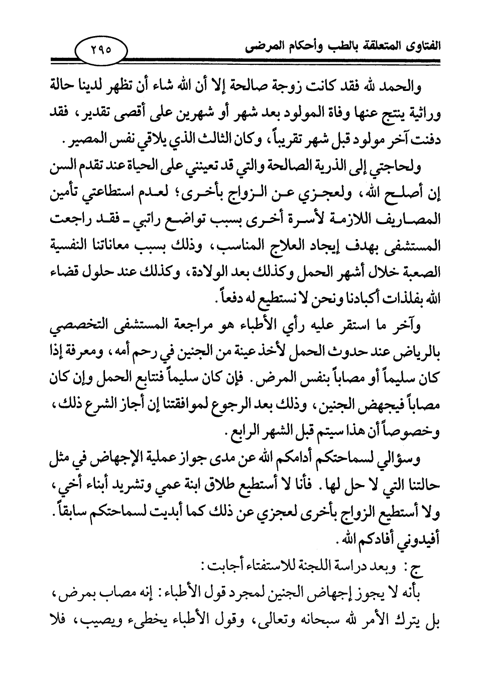 وآخر ما استقر عليه رأي الأطباء هو مراجعة المستشفى التخصصي بالرياض عند حدوث الحمل لأخذ عينة من الجنين في رحم أمه، ومعرفة إذا كان سليما أو مصابا بنفس المرض، فإن كان سليما فنتابع الحمل، وإن كان مصابا فيجهض الجنين وذلك بعد الرجوع لموافقتنا إن أجاز الشرع ذلك، وخصوصا أن هذا سيتم قبل الشهر الرابع.