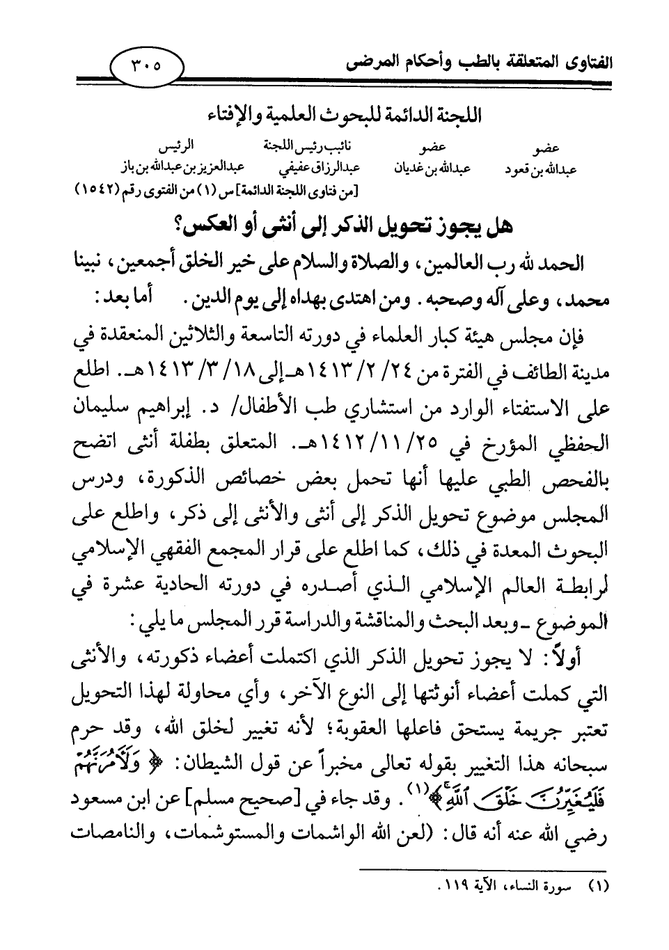 فإن مجلس هيئة كبار العلماء في دورته التاسعة والثلاثين المنعقدة في مدينة الطائف في الفترة من 24 \ 2 \ 1413 هـ إلى 18 \ 3 \ 1413 هـ. اطلع على الاستفتاء الوارد من استشاري طب الأطفال /د. إبراهيم سليمان الحفظي المؤرخ في 25 \ 11 \ 1412 هـ. المتعلق بطفلة أنثى اتضح بالفحص الطبي عليها أنها تحمل بعض خصائص الذكورة، ودرس المجلس موضوع تحويل الذكر إلى أنثى والأنثى إلى ذكر واطلع على البحوث المعدة في ذلك، كما اطلع على قرار المجمع الفقهي الإسلامي لرابطة العالم الإسلامي الذي أصدره في دورته الحادية عشرة في الموضوع - وبعد البحث والمناقشة والدراسة قرر المجلس ما يلي: