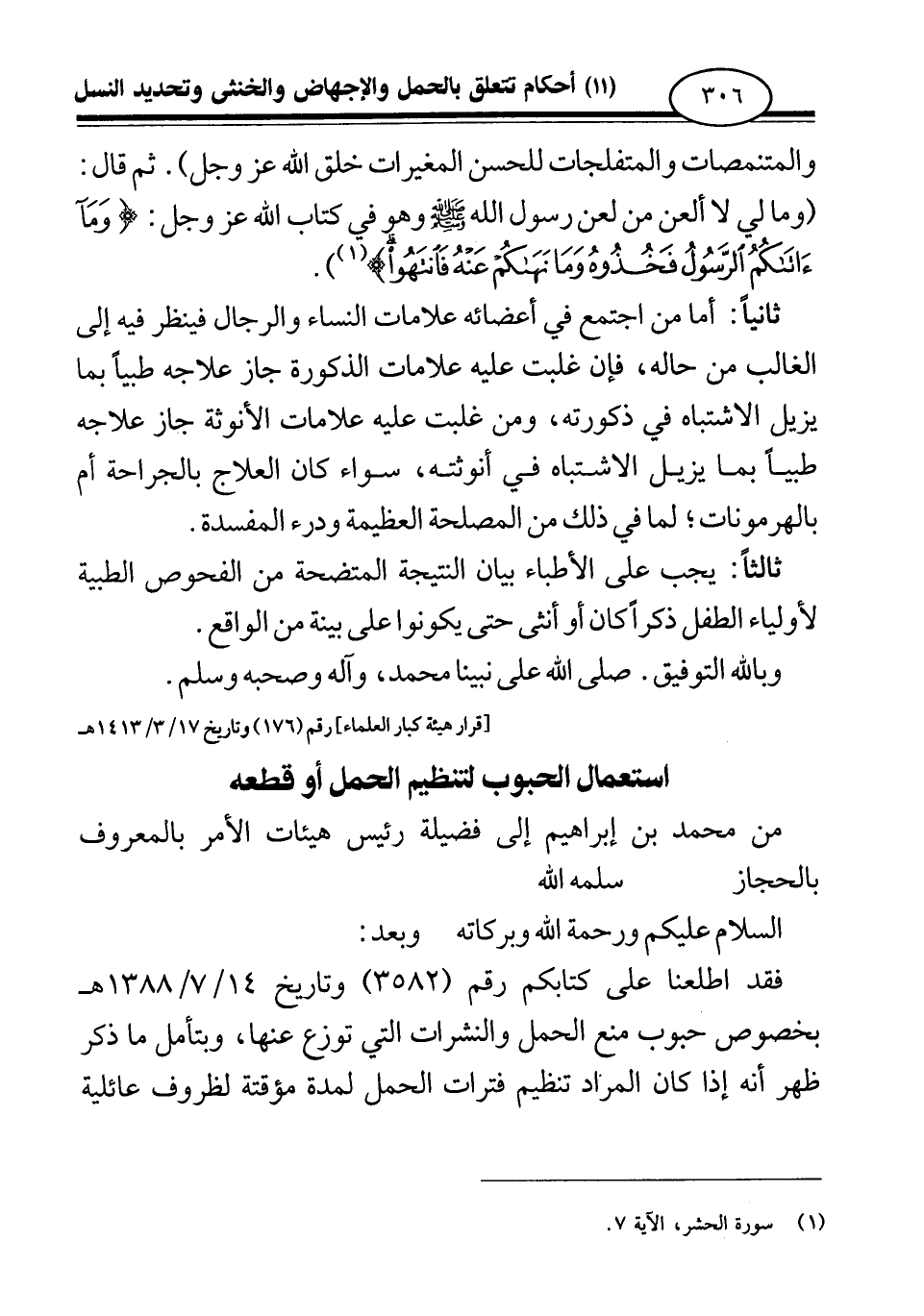 فقد اطلعنا على كتابكم رقم (3582) وتاريخ 14 \7 \1388 هـ بخصوص حبوب منع الحمل والنشرات التي توزع عنها، وبتأمل ما ذكر ظهر أنه إذا كان المراد تنظيم فترات الحمل لمدة مؤقتة لظروف عائلية.