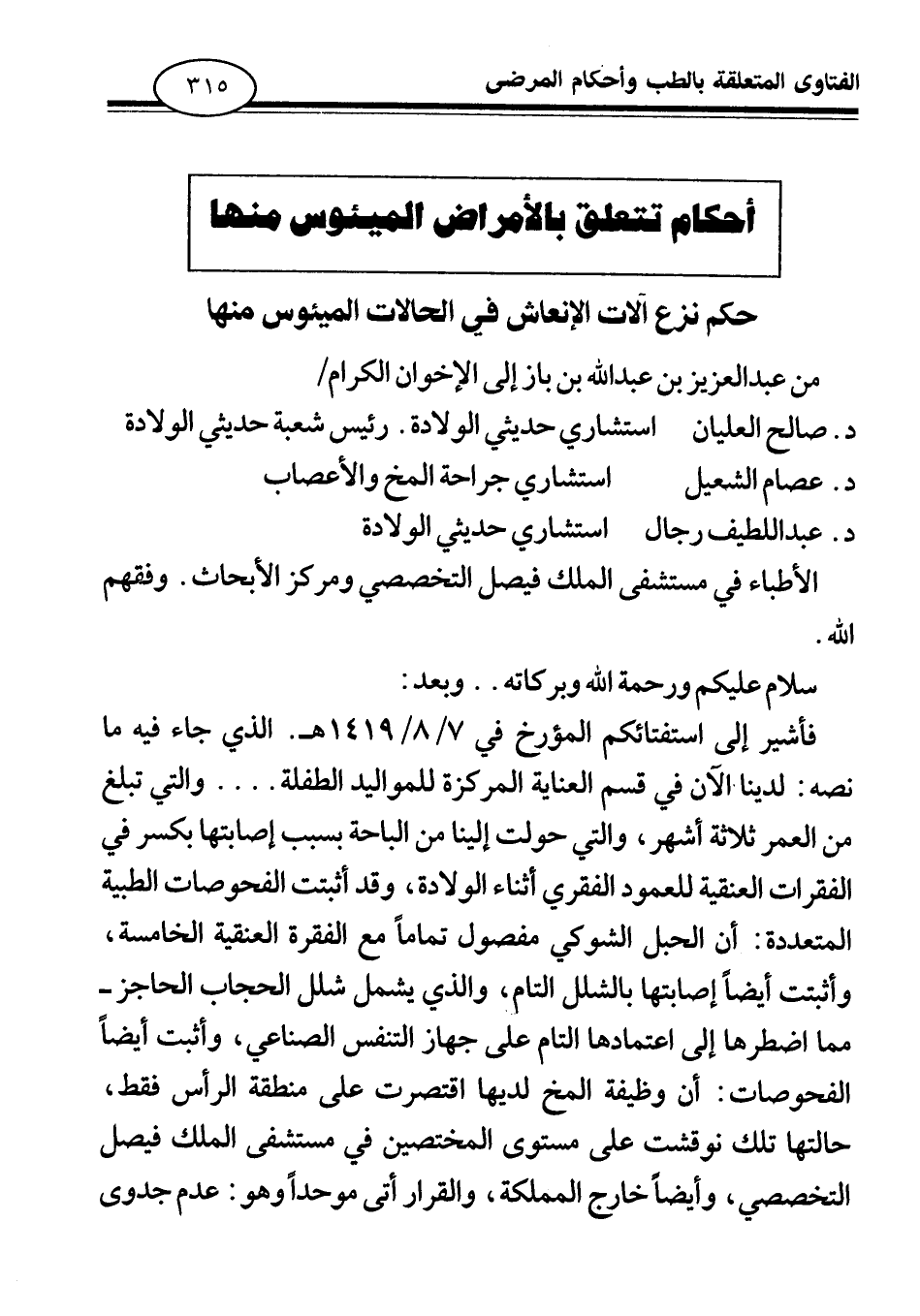 فأشير إلى استفتائكم المؤرخ في 7 \ 8 \ 1419 هـ. الذي جاء فيه ما نصه: لدينا الآن في قسم العناية المركزة للمواليد الطفلة. . . . والتي تبلغ من العمر ثلاثة أشهر، والتي حولت إلينا من الباحة بسبب إصابتها بكسر في الفقرات العنقية للعمود الفقري أثناء الولادة، وقد أثبتت الفحوصات الطبية المتعددة: أن الحبل الشوكي مفصول تماما مع الفقرة العنقية الخامسة، وأثبتت أيضا إصابتها بالشلل التام، والذي يشمل شلل الحجاب الحاجز - مما اضطرها إلى اعتمادها التام على جهاز التنفس الصناعي، وأثبت أيضا الفحوصات: أن وظيفة المخ لديها اقتصرت على منطقة الرأس فقط، حالتها تلك نوقشت على مستوى المختصين في مستشفى الملك فيصل التخصصي، وأيضا خارج المملكة، والقرار أتى موحدا وهو: عدم جدوى