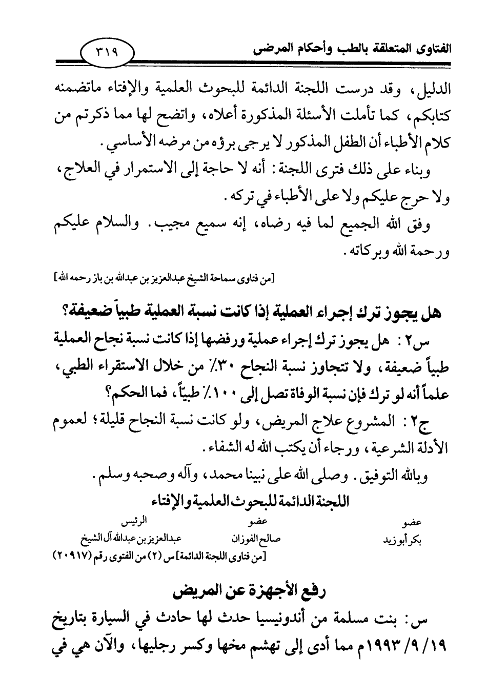 الدليل، وقد درست اللجنة الدائمة للبحوث العلمية والإفتاء ما تضمنه كتابكم، كما تأملت الأسئلة المذكورة أعلاه، واتضح لها مما ذكرتم من كلام الأطباء أن الطفل المذكور لا يرجى برؤه من مرضه الأساسي.