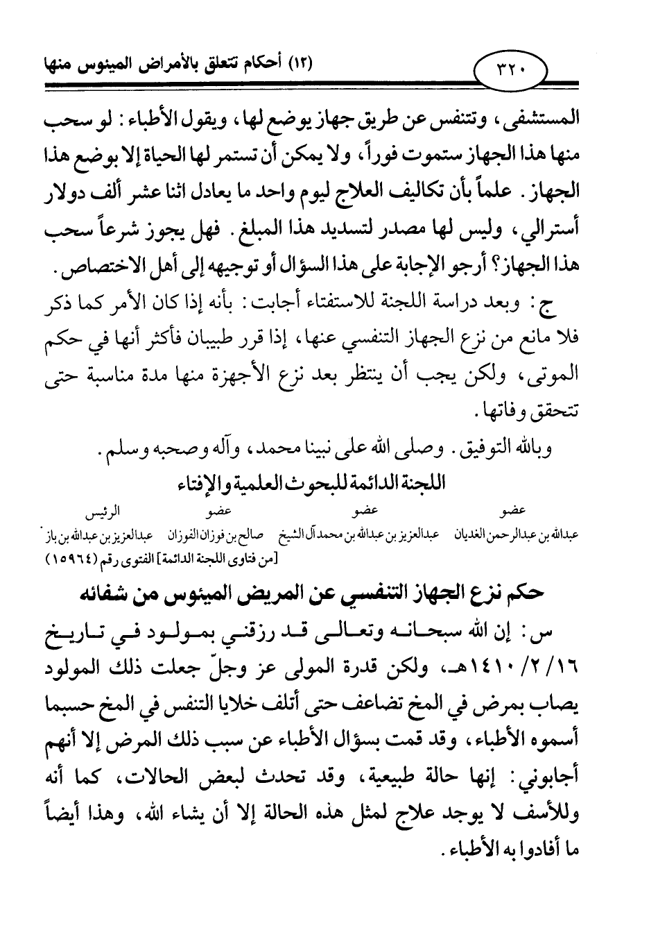 ج: وبعد دراسة اللجنة للاستفتاء أجابت: بأنه إذا كان الأمر كما ذكر فلا مانع من نزع الجهاز التنفسي عنها، إذا قرر طبيبان فأكثر أنها في حكم الموتى، ولكن يجب أن ينتظر بعد نزع الأجهزة منها مدة مناسبة حتى تتحقق وفاتها.