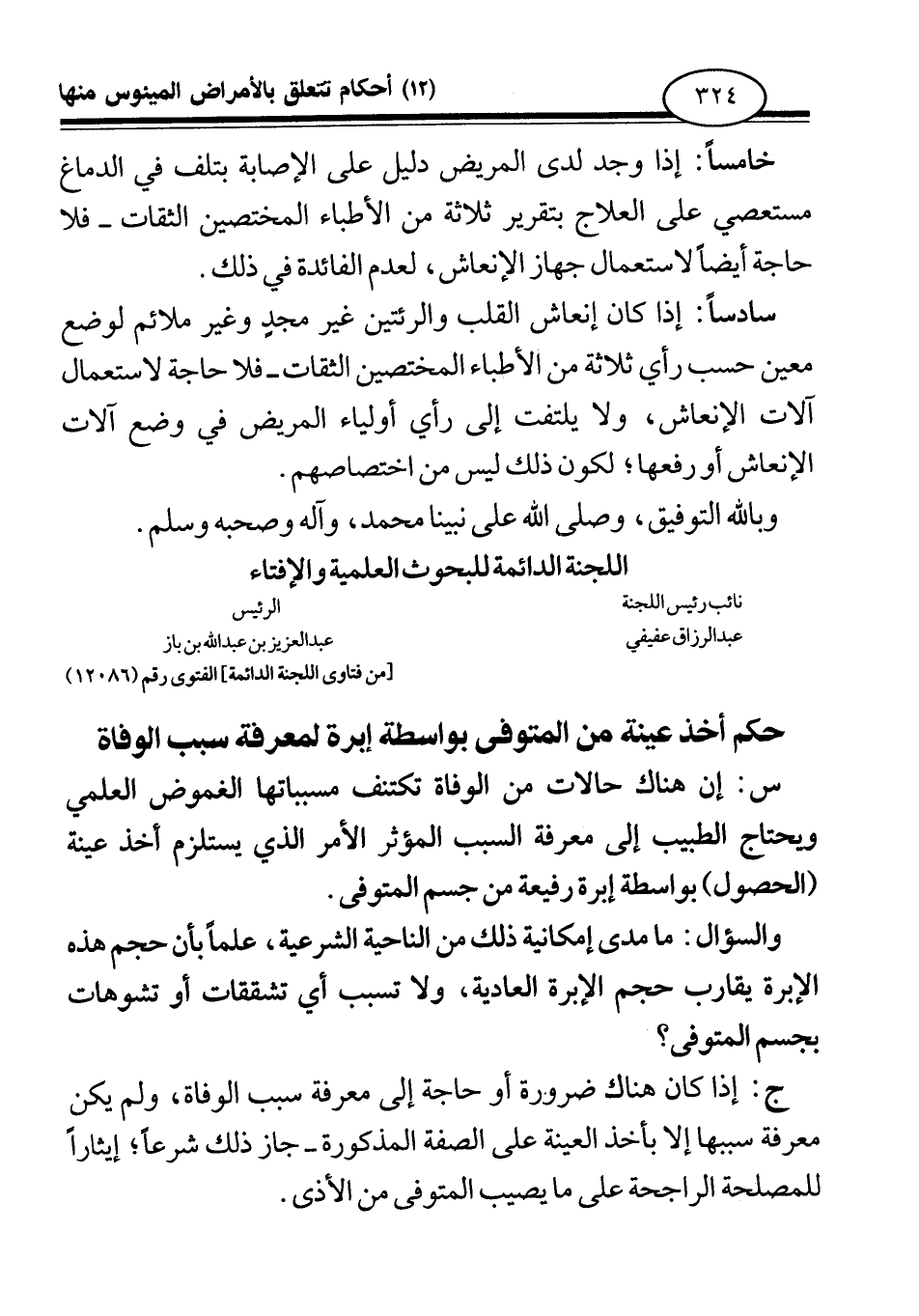 خامسا: إذا وجد لدى المريض دليل على الإصابة بتلف في الدماغ مستعص على العلاج بتقرير ثلاثة من الأطباء المختصين الثقات - فلا حاجة أيضا لاستعمال جهاز الإنعاش، لعدم الفائدة في ذلك.