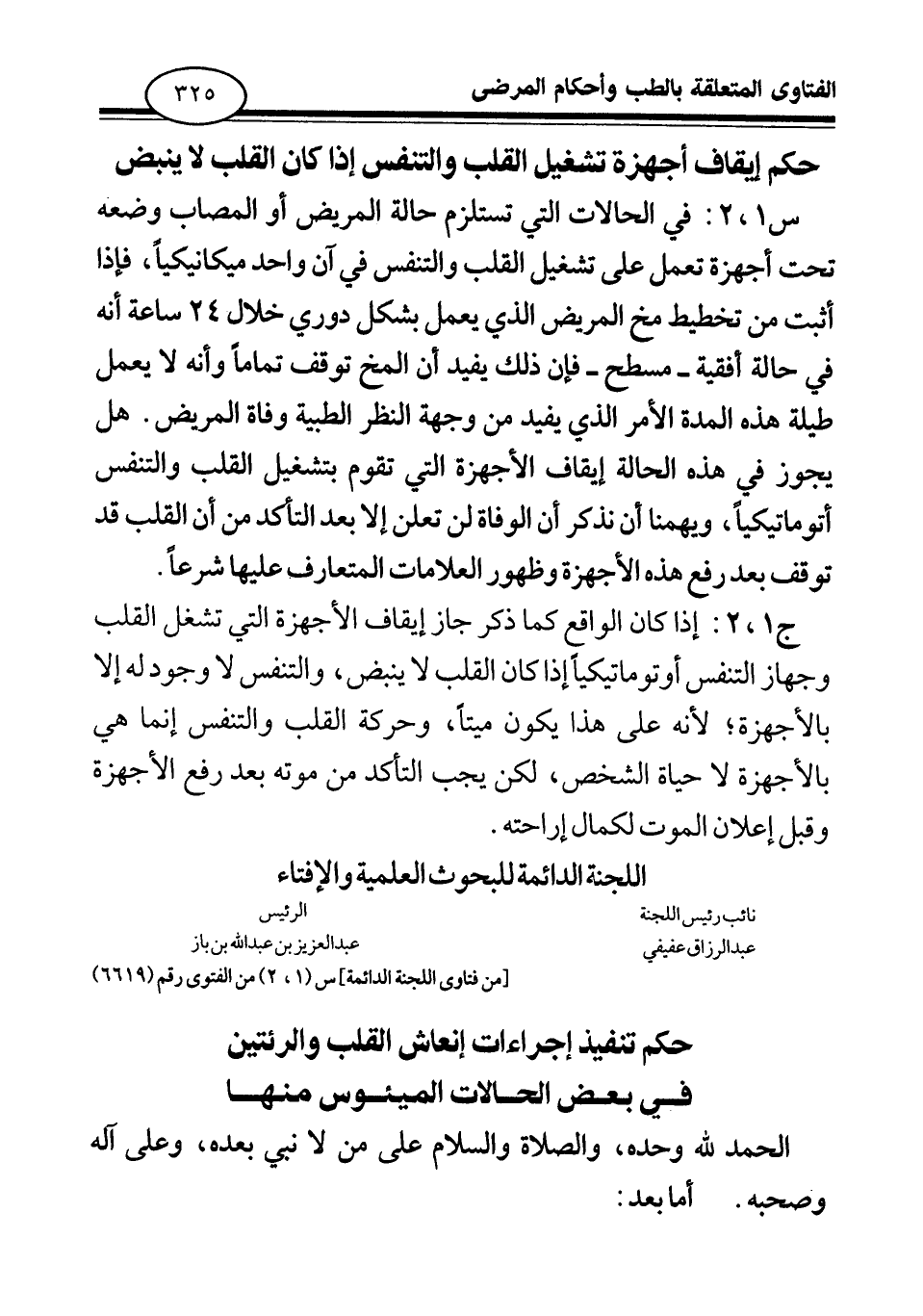 س1، 2: في الحالات التي تستلزم حالة المريض أو المصاب وضعه تحت أجهزة تعمل على تشغيل القلب والتنفس في آن واحد ميكانيكيا، فإذا أثبت من تخطيط مخ المريض الذي يعمل بشكل دوري خلال 24 ساعة أنه في حالة أفقية - مسطح - فإن ذلك يفيد أن المخ توقف تماما وأنه لا يعمل طيلة هذه المدة الأمر الذي يفيد من وجهة النظر الطبية وفاة المريض. هل يجوز في هذه الحالة إيقاف الأجهزة التي تقوم بتشغيل القلب والتنفس أتوماتيكيا، ويهمنا أن نذكر أن الوفاة لن تعلن إلا بعد التأكد من أن القلب قد توقف بعد رفع هذه الأجهزة وظهور العلامات المتعارف عليها شرعا.