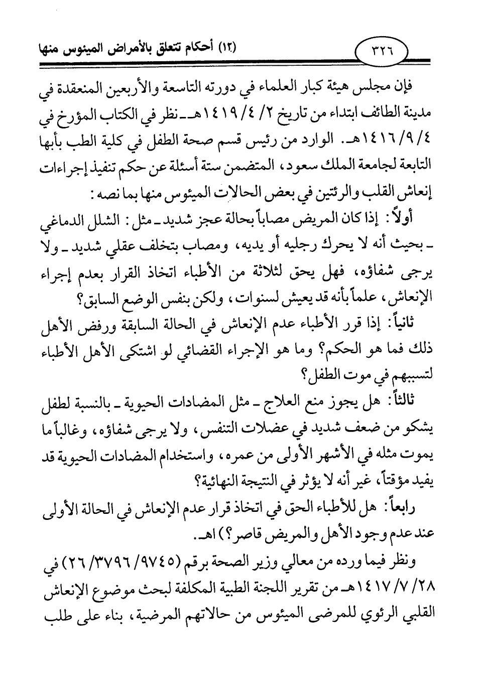 فإن مجلس هيئة كبار العلماء في دورته التاسعة والأربعين المنعقدة في مدينة الطائف ابتداء من تاريخ 2 \4 \1419 هـ - نظر في الكتاب المؤرخ في 4 \ 9 \ 1416 هـ. الوارد من رئيس قسم صحة الطفل في كلية الطب بأبها التابعة لجامعة الملك سعود، المتضمن ستة أسئلة عن حكم تنفيذ إجراءات إنعاش القلب والرئتين في بعض الحالات الميئوس منها بما نصه:
