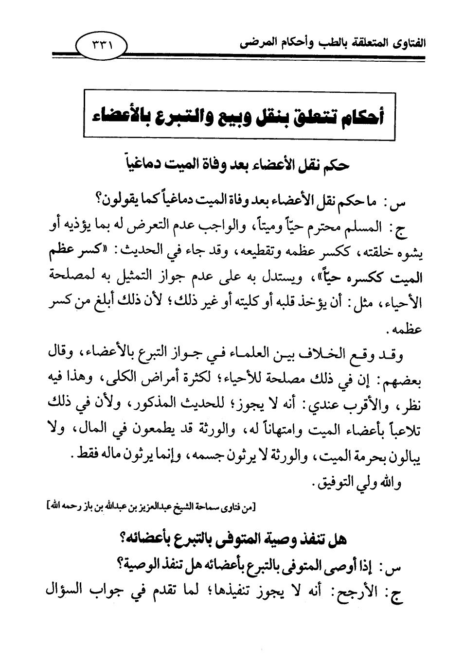 س: إذا أوصى المتوفى بالتبرع بأعضائه هل تنفذ الوصية؟ .