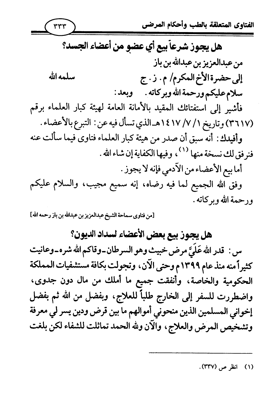 فأشير إلى استفتائك المقيد بالأمانة العامة لهيئة كبار العلماء برقم (3617) وتاريخ 1 \7 \1417 هـ الذي تسأل فيه عن: التبرع بالأعضاء.