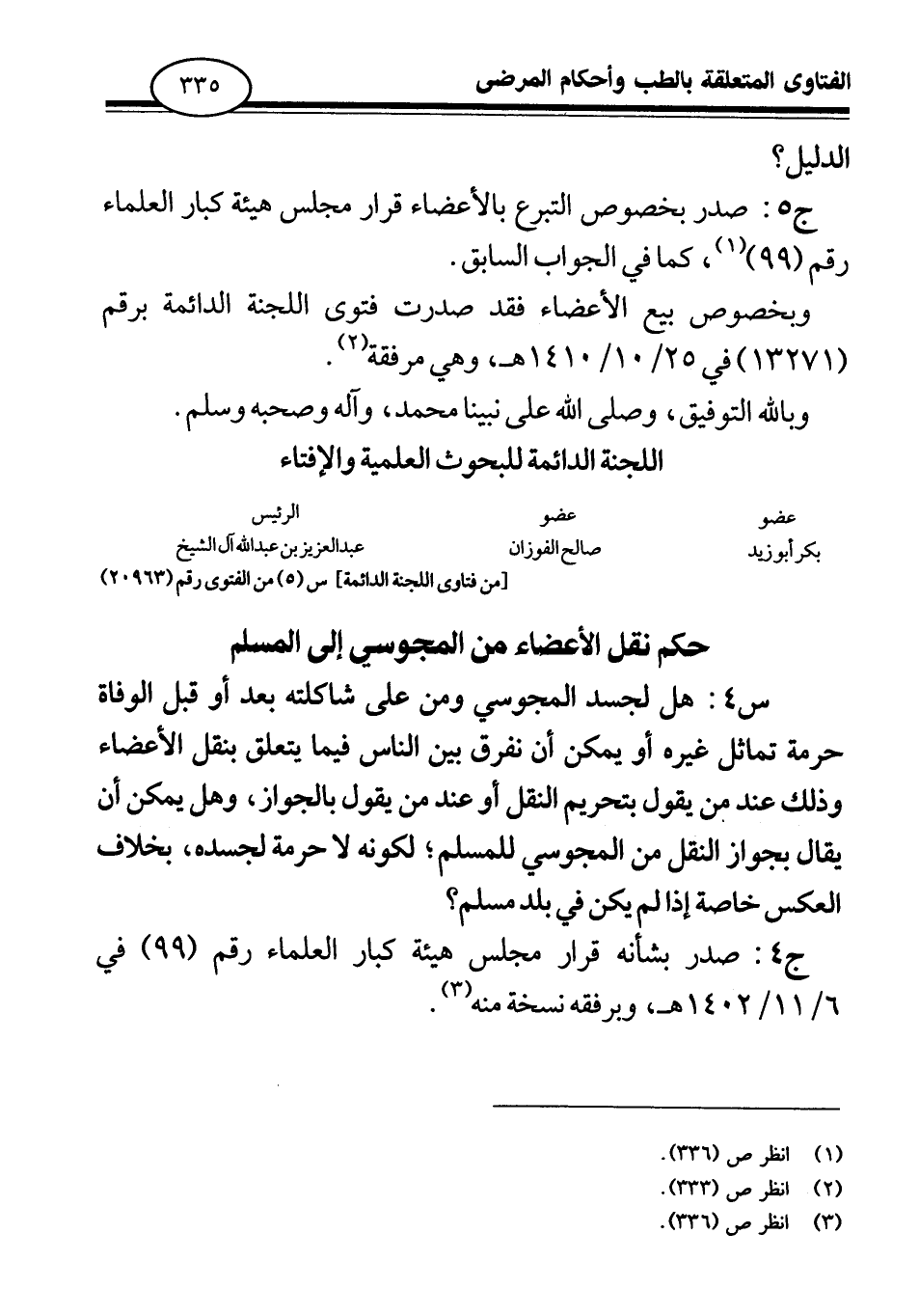 وبخصوص بيع الأعضاء فقد صدرت فتوى اللجنة الدائمة برقم (13271) في 25 \ 10 \ 1410 هـ، وهي مرفقة (¬2) .