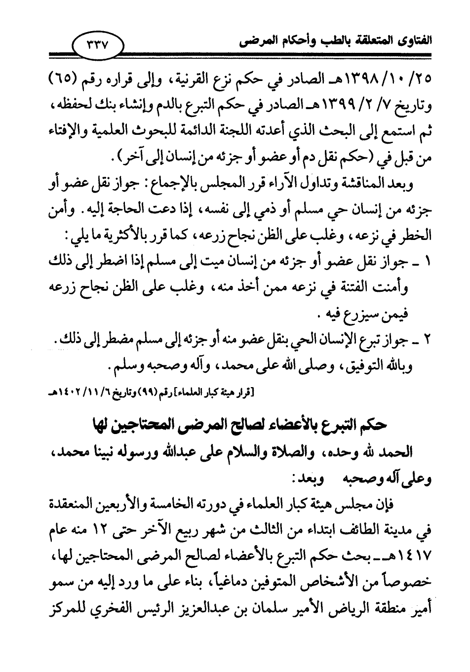 25 \10 \1398 هـ الصادر في حكم نزع القرنية، وإلى قراره رقم (65) وتاريخ 7 \2 \1399 هـ الصادر في حكم التبرع بالدم وإنشاء بنك لحفظه، ثم استمع إلى البحث الذي أعدته اللجنة الدائمة للبحوث العلمية والإفتاء من قبل في (حكم نقل دم أو عضو أو جزئه من إنسان إلى آخر) .