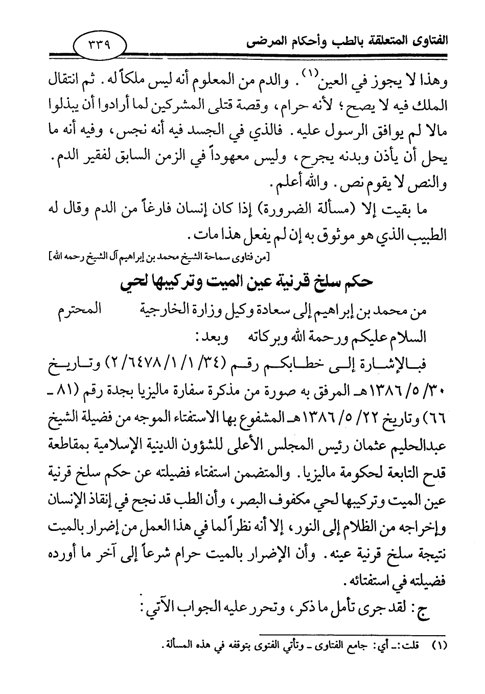 فبالإشارة إلى خطابكم رقم (34 \1 \1 \6478 \2) وتاريخ 30 \5 \1386 هـ المرفق به صورة من مذكرة سفارة ماليزيا بجدة رقم (81 - 66) وتاريخ 22 \5 \1386 هـ المشفوع بها الاستفتاء الموجه من فضيلة الشيخ عبد الحليم عثمان رئيس المجلس الأعلى للشؤون الدينية الإسلامية بمقاطعة قدح التابعة لحكومة ماليزيا. والمتضمن استفتاء فضيلته عن حكم سلخ قرنية عين الميت وتركيبها لحي مكفوف البصر، وأن الطب قد نجح في إنقاذ الإنسان وإخراجه من الظلام إلى النور، إلا أنه نظرا لما في هذا العمل من إضرار بالميت نتيجة سلخ قرنية عينه. وأن الإضرار بالميت حرام شرعا إلى آخر ما أورده فضيلته في استفتائه.