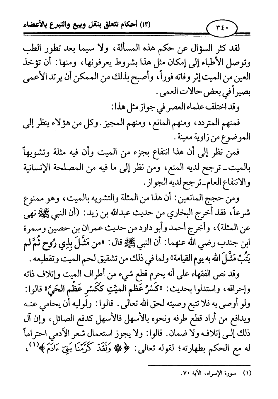 وقد نص الفقهاء على أنه يحرم قطع شيء من أطراف الميت وإتلاف ذاته وإحراقه، واستدلوا بحديث: «كسر عظم الميت ككسر عظم الحي (¬2) » قالوا: ولو أوصى به فلا تتبع وصيته لحق الله تعالى. قالوا: ولوليه أن يحامي عنه ويدافع من أراد قطع طرفه ونحوه بالأسهل فالأسهل كدفع الصائل، وإن آل ذلك إلى إتلافه ولا ضمان. قالوا: ولا يجوز استعمال شعر الآدمي احتراما له مع الحكم بطهارته؛ لقوله تعالى: {وَلَقَدْ كَرَّمْنَا بَنِي آدَمَ} (¬3) .