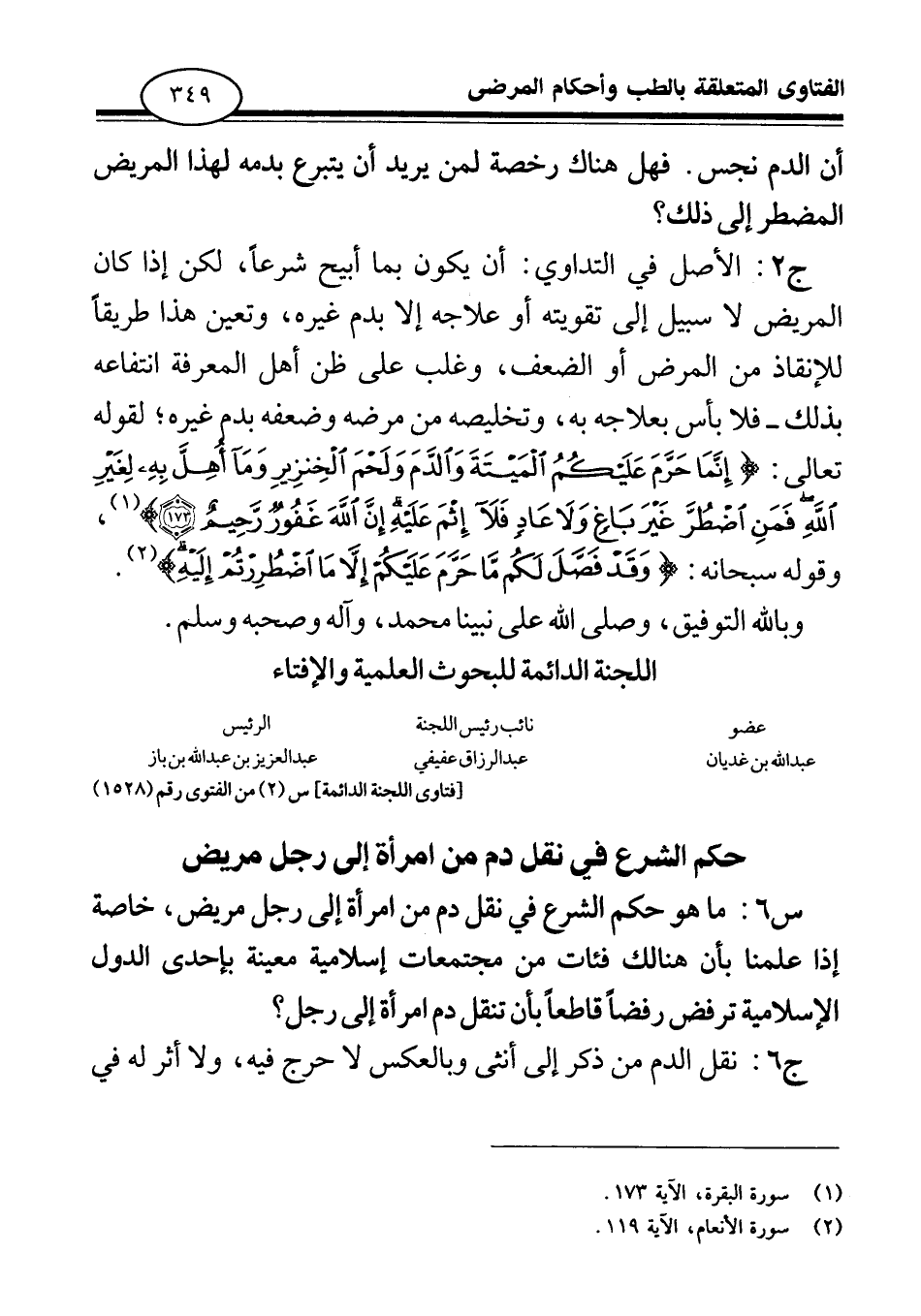 ج 2: الأصل في التداوي: أن يكون بما أبيح شرعا، لكن إذا كان المريض لا سبيل إلى تقويته أو علاجه إلا بدم غيره وتعين هذا طريقا للإنقاذ من المرض أو الضعف، وغلب على ظن أهل المعرفة بذلك انتفاعه بذلك، فلا بأس بعلاجه به، وتخليصه من مرضه وضعفه بدم غيره، لقوله تعالى: {إِنَّمَا حَرَّمَ عَلَيْكُمُ الْمَيْتَةَ وَالدَّمَ وَلَحْمَ الْخِنْزِيرِ وَمَا أُهِلَّ بِهِ لِغَيْرِ اللَّهِ فَمَنِ اضْطُرَّ غَيْرَ بَاغٍ وَلَا عَادٍ فَلَا إِثْمَ عَلَيْهِ إِنَّ اللَّهَ غَفُورٌ رَحِيمٌ} (¬1) وقوله: سبحانه {وَقَدْ فَصَّلَ لَكُمْ مَا حَرَّمَ عَلَيْكُمْ إِلَّا مَا اضْطُرِرْتُمْ إِلَيْهِ} (¬2)