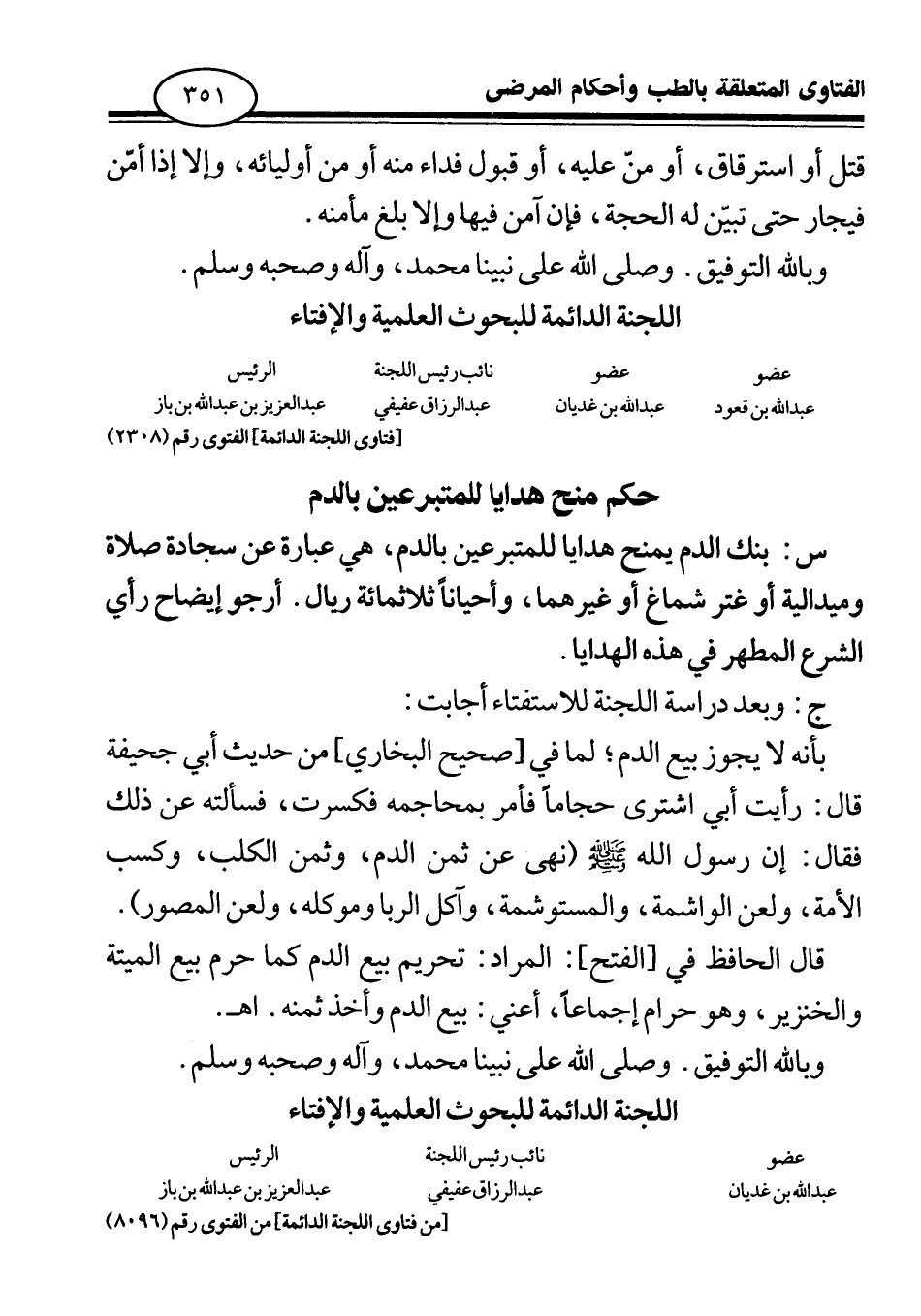 س: بنك الدم يمنح هدايا للمتبرعين بالدم، هي عبارة عن سجادة صلاة وميدالية أو غتر شماغ أو غيرهما، وأحيانا ثلاثمائة ريال. أرجو إيضاح رأي الشرع المطهر في هذه الهدايا.