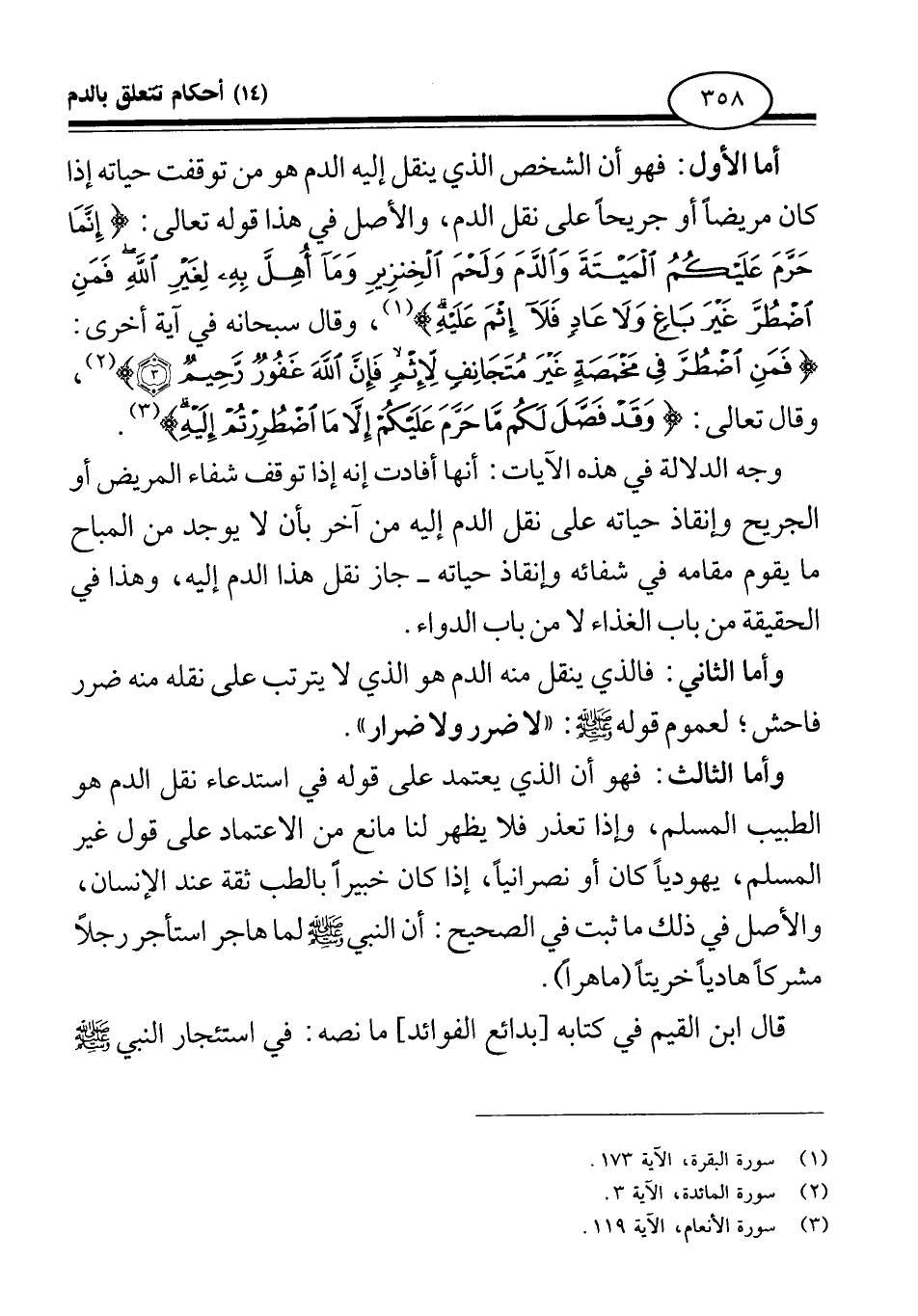 أما الأول: فهو أن الشخص الذي ينقل إليه الدم هو: من توقفت حياته إذا كان مريضا أو جريحا على نقل الدم. والأصل في هذا قوله تعالى: {إِنَّمَا حَرَّمَ عَلَيْكُمُ الْمَيْتَةَ وَالدَّمَ وَلَحْمَ الْخِنْزِيرِ وَمَا أُهِلَّ بِهِ لِغَيْرِ اللَّهِ فَمَنِ اضْطُرَّ غَيْرَ بَاغٍ وَلَا عَادٍ فَلَا إِثْمَ عَلَيْهِ} (¬1) ، وقال سبحانه في آية أخرى: {فَمَنِ اضْطُرَّ فِي مَخْمَصَةٍ غَيْرَ مُتَجَانِفٍ لِإِثْمٍ فَإِنَّ اللَّهَ غَفُورٌ رَحِيمٌ} (¬2) ، وقال تعالى: {وَقَدْ فَصَّلَ لَكُمْ مَا حَرَّمَ عَلَيْكُمْ إِلَّا مَا اضْطُرِرْتُمْ إِلَيْهِ} (¬3) .
