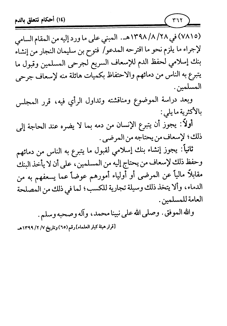 (7815) في 28 \ 8 \ 1398 هـ. المبني على ما ورد إليه من المقام السامي لإجراء ما يلزم نحو ما اقترحه المدعو: فتوح بن سليمان النجار من إنشاء بنك إسلامي لحفظ الدم للإسعاف السريع لجرحى المسلمين وقبول ما يتبرع به الناس من دمائهم والاحتفاظ بكميات هائلة منه لإسعاف جرحى المسلمين.