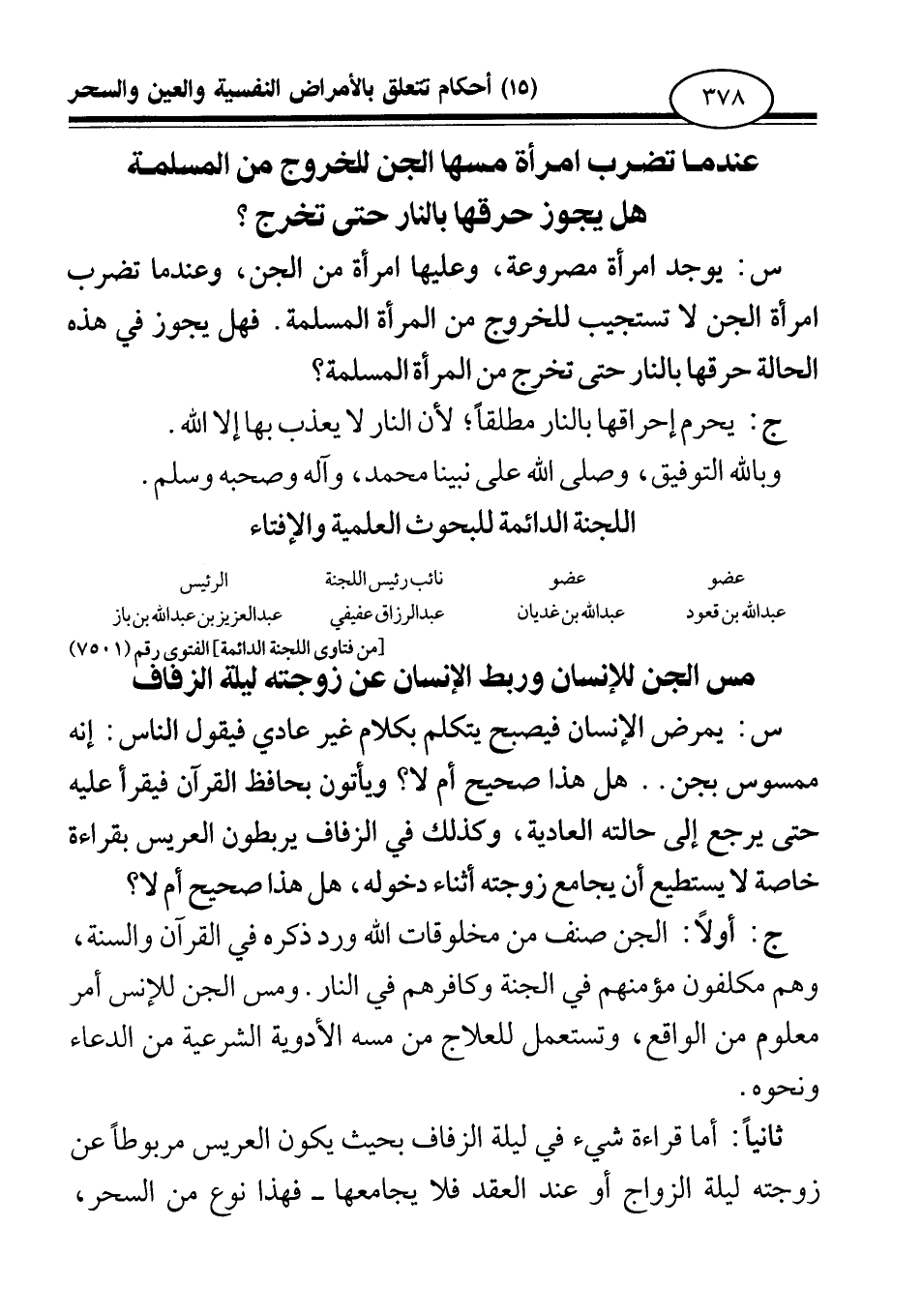 س: يوجد امرأة مصروعة وعليها امرأة من الجن وعندما تضرب امرأة الجن لا تستجيب للخروج من المرأة المسلمة فهل يجوز في هذه الحالة حرقها بالنار حتى تخرج من المرأة المسلمة؟
