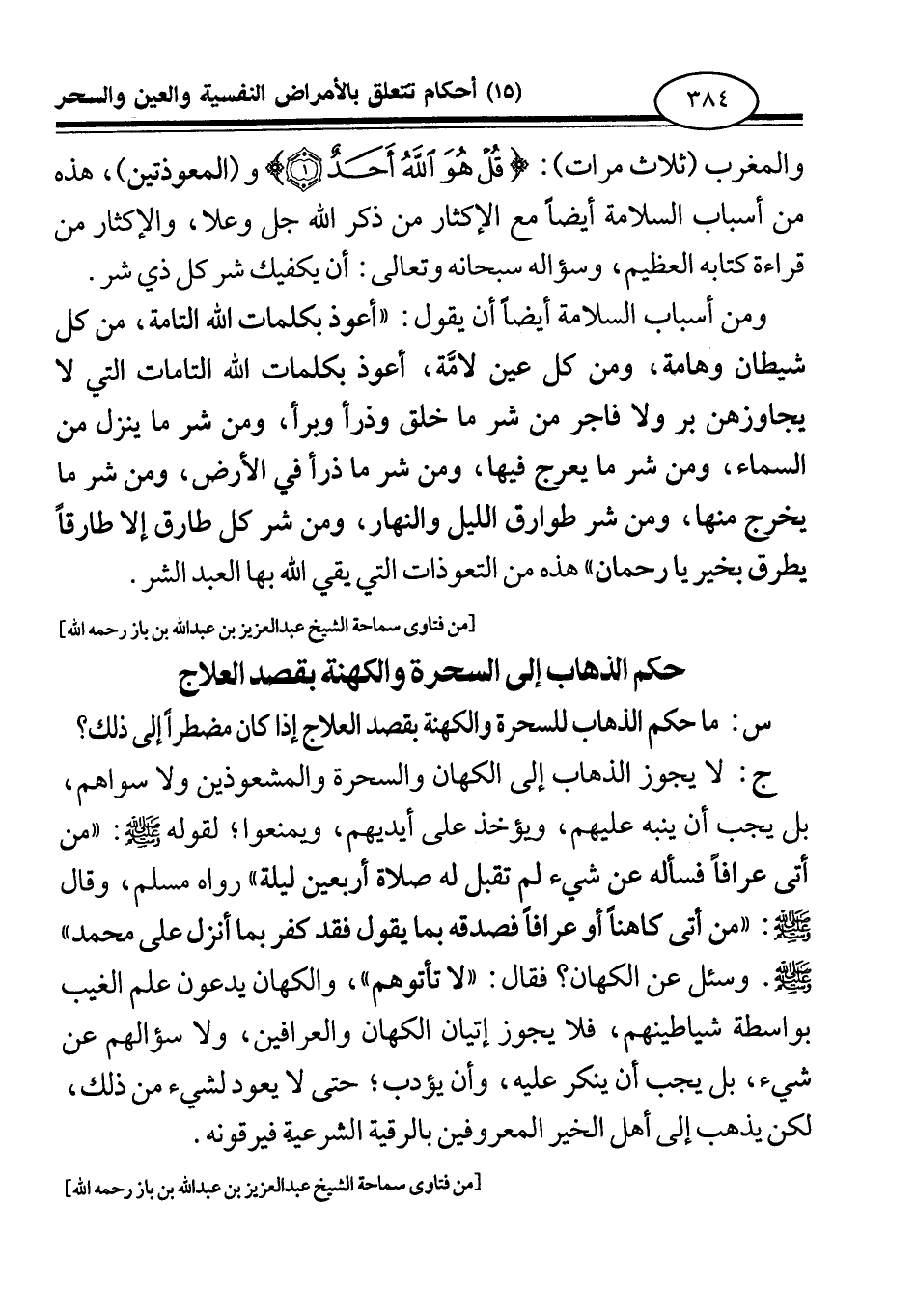 والمغرب (ثلاث مرات) : {قُلْ هُوَ اللَّهُ أَحَدٌ} (¬1) و (المعوذتين) ، هذه من أسباب السلامة أيضا مع الإكثار من ذكر الله جل وعلا، والإكثار من قراءة كتابه العظيم، وسؤاله سبحانه وتعالى: أن يكفيك شر كل ذي شر.