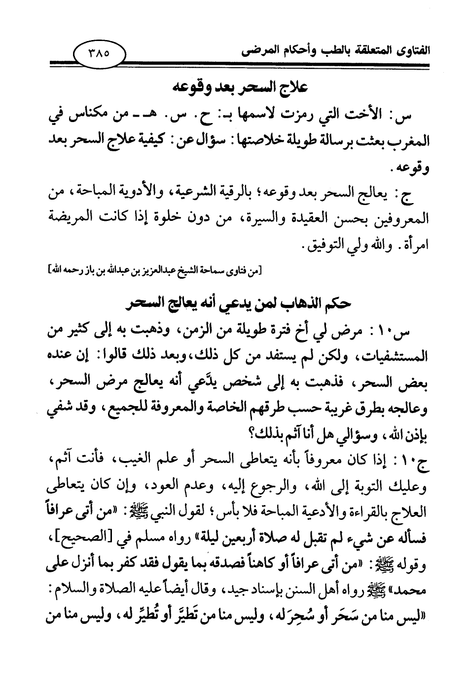 ج 10: إذا كان معروفا بأنه يتعاطى السحر أو علم الغيب، فأنت آثم، وعليك التوبة إلى الله، والرجوع إليه، وعدم العود، وإن كان يتعاطى العلاج بالقراءة والأدعية المباحة فلا بأس؛ لقول النبي صلى الله عليه وسلم: «من أتى عرافا فسأله عن شيء لم تقبل له صلاة أربعين ليلة (¬1) » رواه مسلم في الصحيح، وقوله صلى الله عليه وسلم: «من أتى عرافا أو كاهنا فصدقه بما يقول فقد كفر بما أنزل على محمد صلى الله عليه وسلم (¬2) » . رواه أهل السنن بإسناد جيد، وقال أيضا عليه الصلاة والسلام: «ليس منا من سحر أو سحر له، وليس منا من تطير أو تطير له، وليس منا من