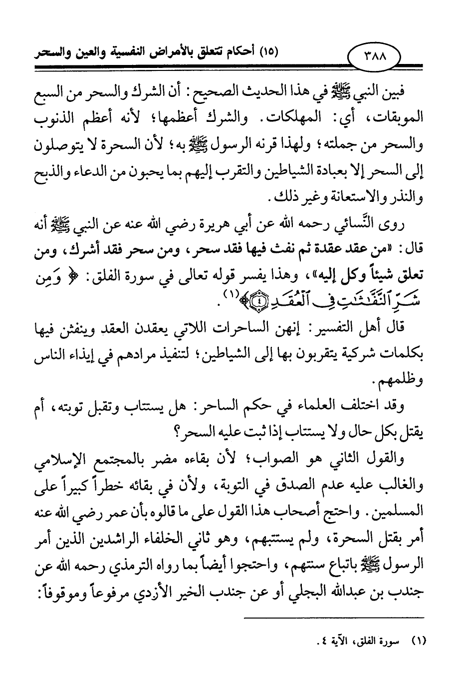 روى النسائي رحمه الله عن أبي هريرة رضي الله عنه عن النبي صلى الله عليه وسلم أنه قال: «من عقد عقدة ثم نفث فيها فقد سحر ومن سحر فقد أشرك ومن تعلق شيئا وكل إليه (¬1) » وهذا يفسر قوله تعالى في سورة الفلق: {وَمِنْ شَرِّ النَّفَّاثَاتِ فِي الْعُقَدِ} (¬2)