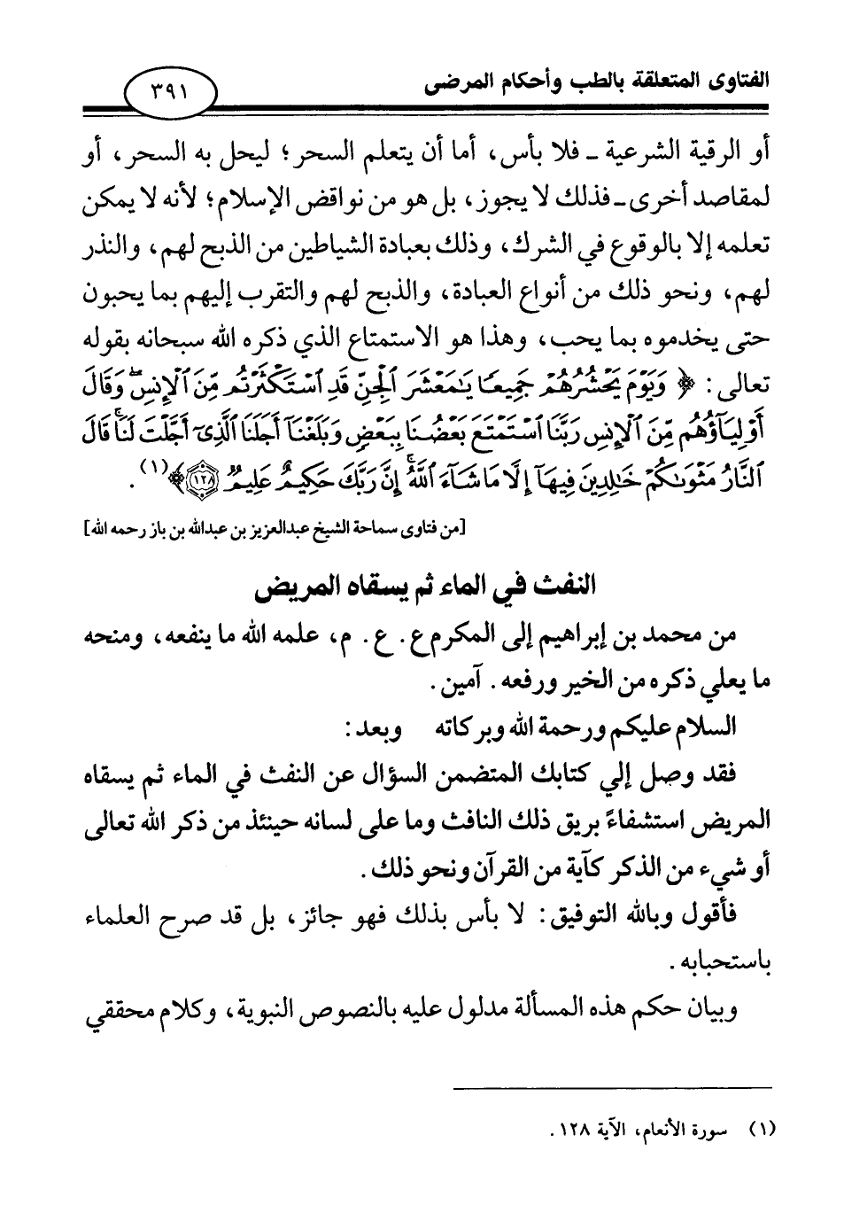 فقد وصل إلي كتابك المتضمن السؤال عن النفث في الماء ثم يسقاه المريض استشفاء بريق ذلك النافث وما على لسانه حينئذ من ذكر الله تعالى أو شيء من الذكر كآية من القرآن ونحو ذلك.