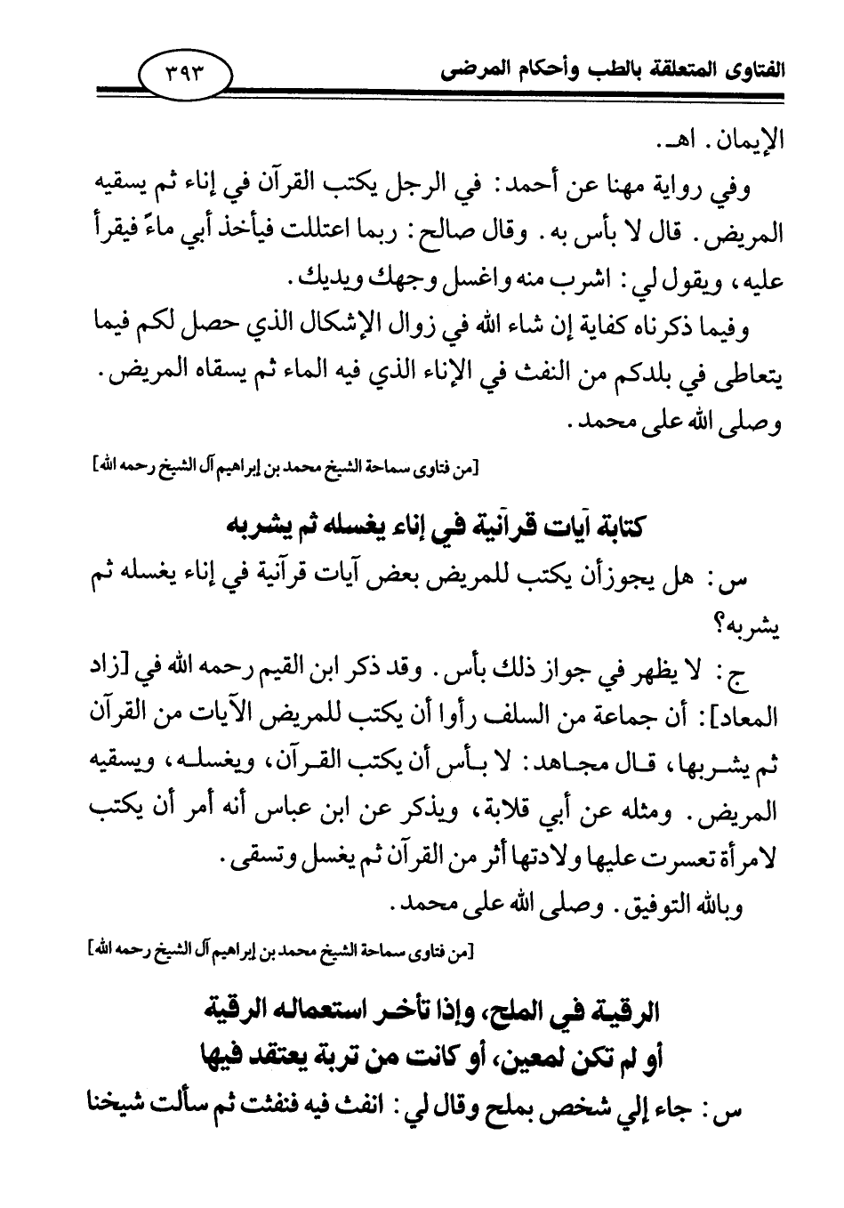 ج: لا يظهر في جواز ذلك بأس. وقد ذكر ابن القيم رحمه الله في (زاد المعاد) : أن جماعة من السلف رأوا أن يكتب للمريض الآيات من القرآن ثم يشربها، قال مجاهد: لا بأس أن يكتب القرآن، ويغسله، ويسقيه المريض. ومثله عن أبي قلابة، ويذكر عن ابن عباس أنه أمر أن يكتب لامرأة تعسرت عليها ولادتها أثر من القرآن ثم يغسل وتسقى. وبالله التوفيق. وصلى الله على محمد.