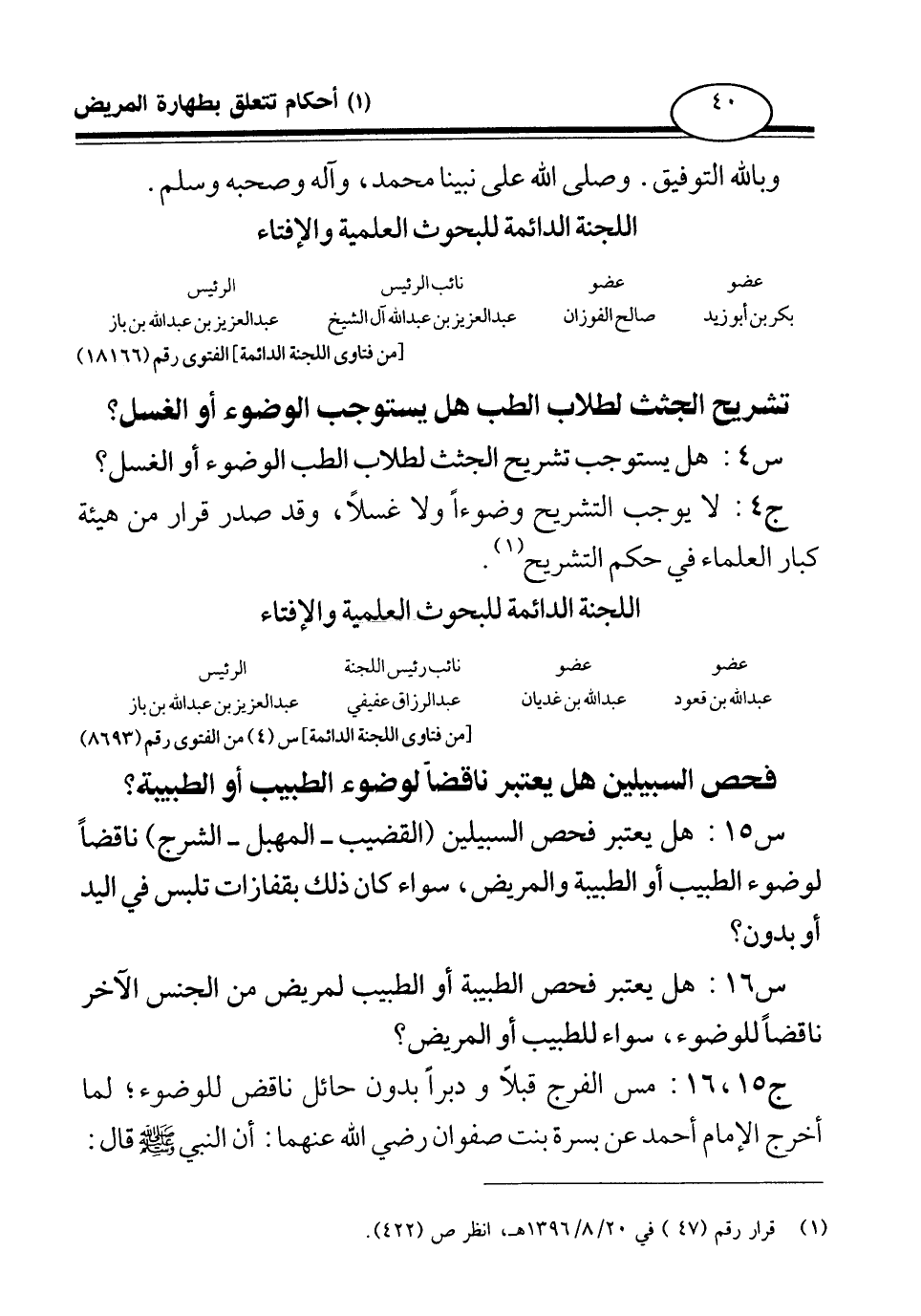 س15: هل يعتبر فحص السبيلين (القضيب- المهبل- الشرج) ناقضا لوضوء الطبيب أو الطبيبة والمريض، سواء كان ذلك بقفازات تلبس في اليد أو بدون؟