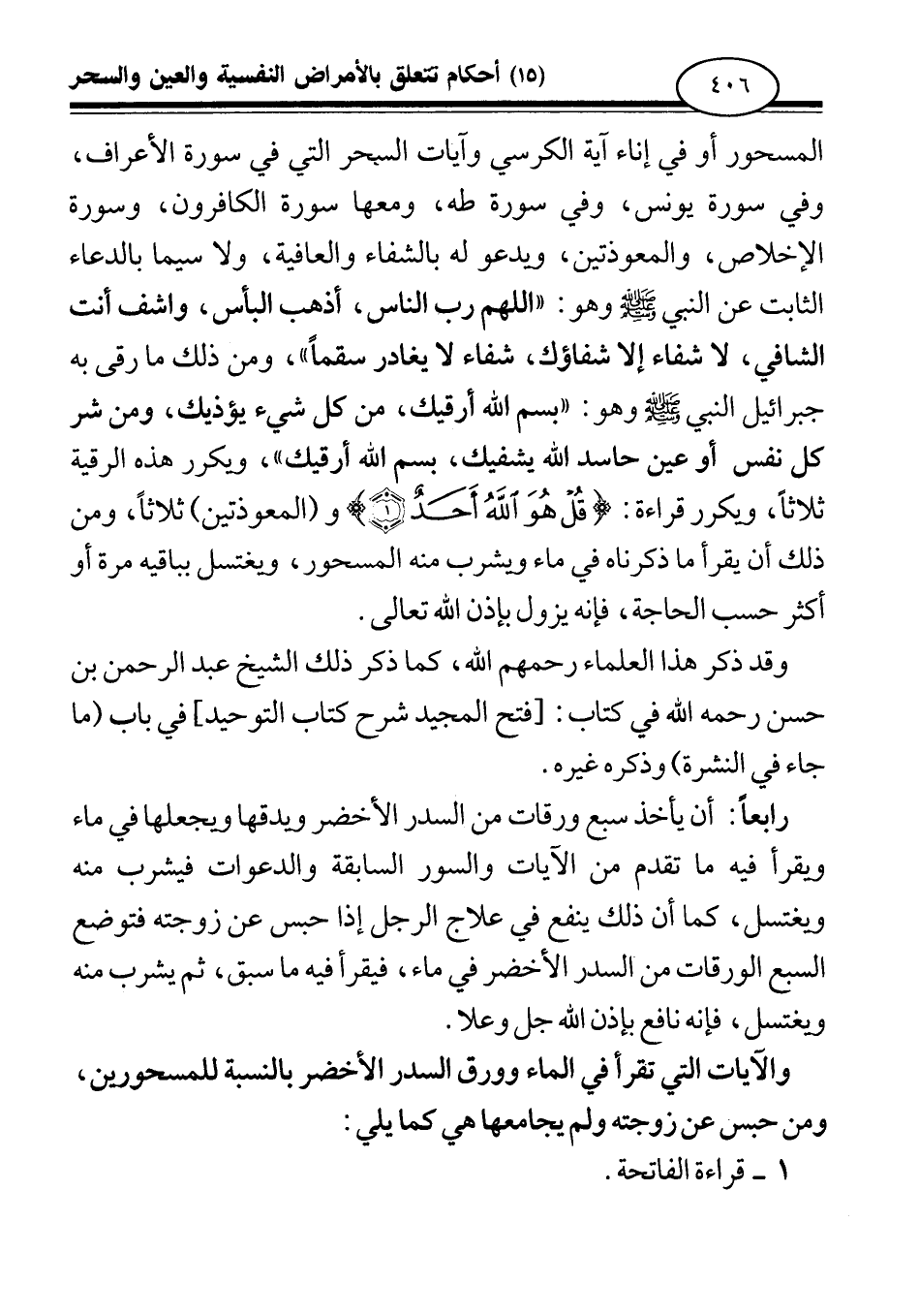 رابعا: أن يأخذ سبع ورقات من السدر الأخضر ويدقها ويجعلها في ماء ويقرأ فيه ما تقدم من الآيات والسور السابقة والدعوات فيشرب منه ويغتسل، كما أن ذلك ينفع في علاج الرجل إذا حبس عن زوجته فتوضع السبع الورقات من السدر الأخضر في ماء فيقرأ فيه ما سبق ثم يشرب منه ويغتسل، فإنه نافع بإذن الله جل وعلا.
