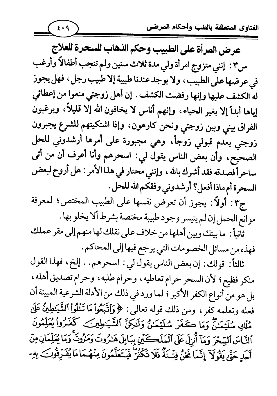 س3: إنني متزوج امرأة ولي مدة ثلاث سنين ولم تنجب أطفالا وأرغب في عرضها على الطبيب ولا يوجد عندنا طبيبة إلا طبيب رجل، فهل يجوز له الكشف عليها وإنها رفضت الكشف. إن أهل زوجتي منعوا من إعطائي إياها أبدا إلا بغير الحياء وإنهم أناس لا يخافون الله إلا قليلا ويرغبون الفراق بيني وبين زوجتي ونحن كارهون وإذا اشتكيتهم للشرع يجبرون زوجتي بعدم قبولي زوجا وهي مجبورة على أمرها أرشدوني للحل الصحيح، وأن بعض الناس يقول لي: اسحرهم وأنا أعرف أن من أتى ساحرا فصدقه فقد أشرك بالله، وإنني محتار في هذا الأمر هل أروح لبعض السحرة أم ماذا أفعل؟ أرشدوني وفقكم الله للحل.
