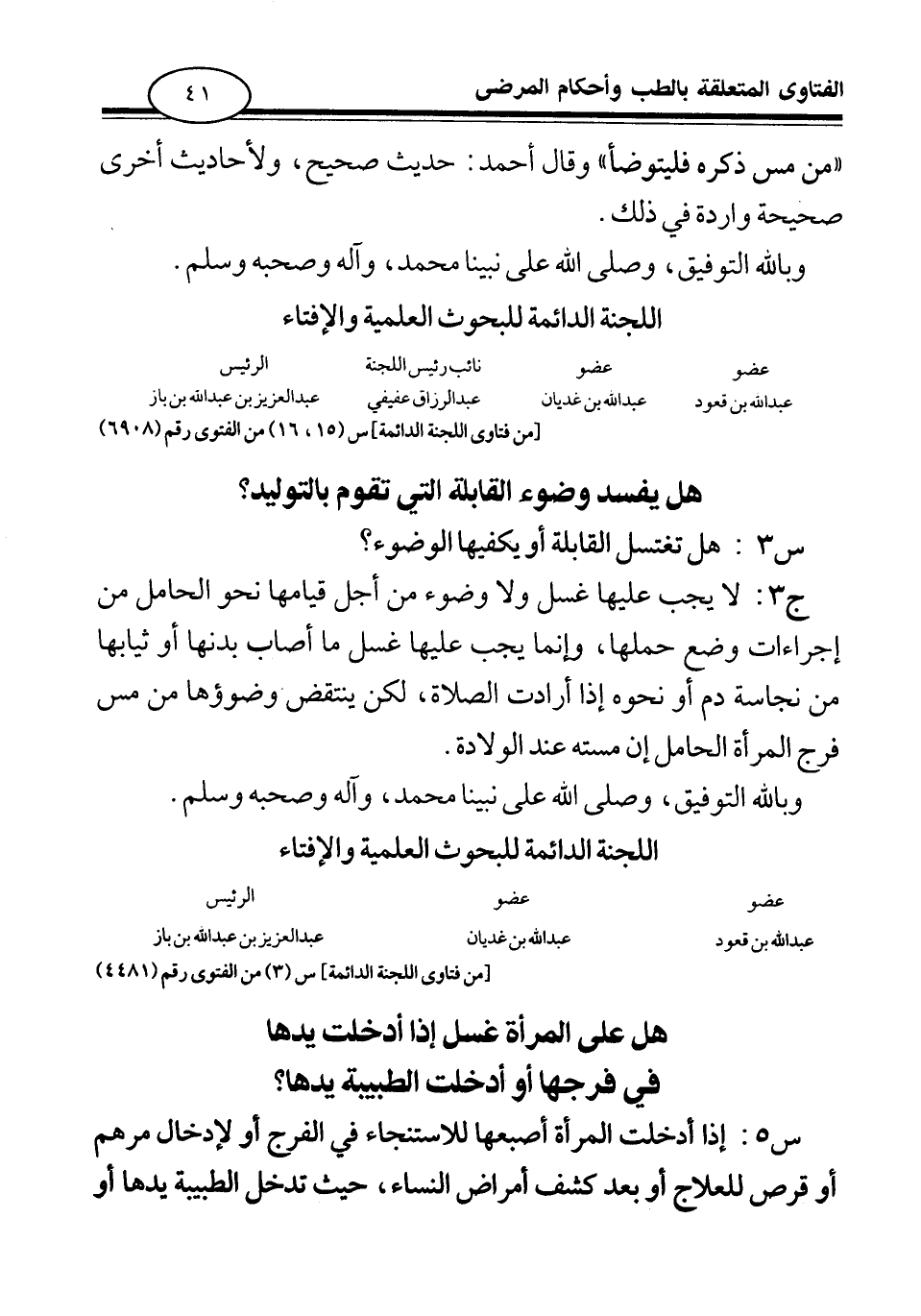 س: إذا أدخلت المرأة أصبعها للاستنجاء في الفرج، أو لإدخال مرهم أو قرص للعلاج أو بعد كشف أمراض النساء؛ حيث تدخل الطبيبة يدها أو
