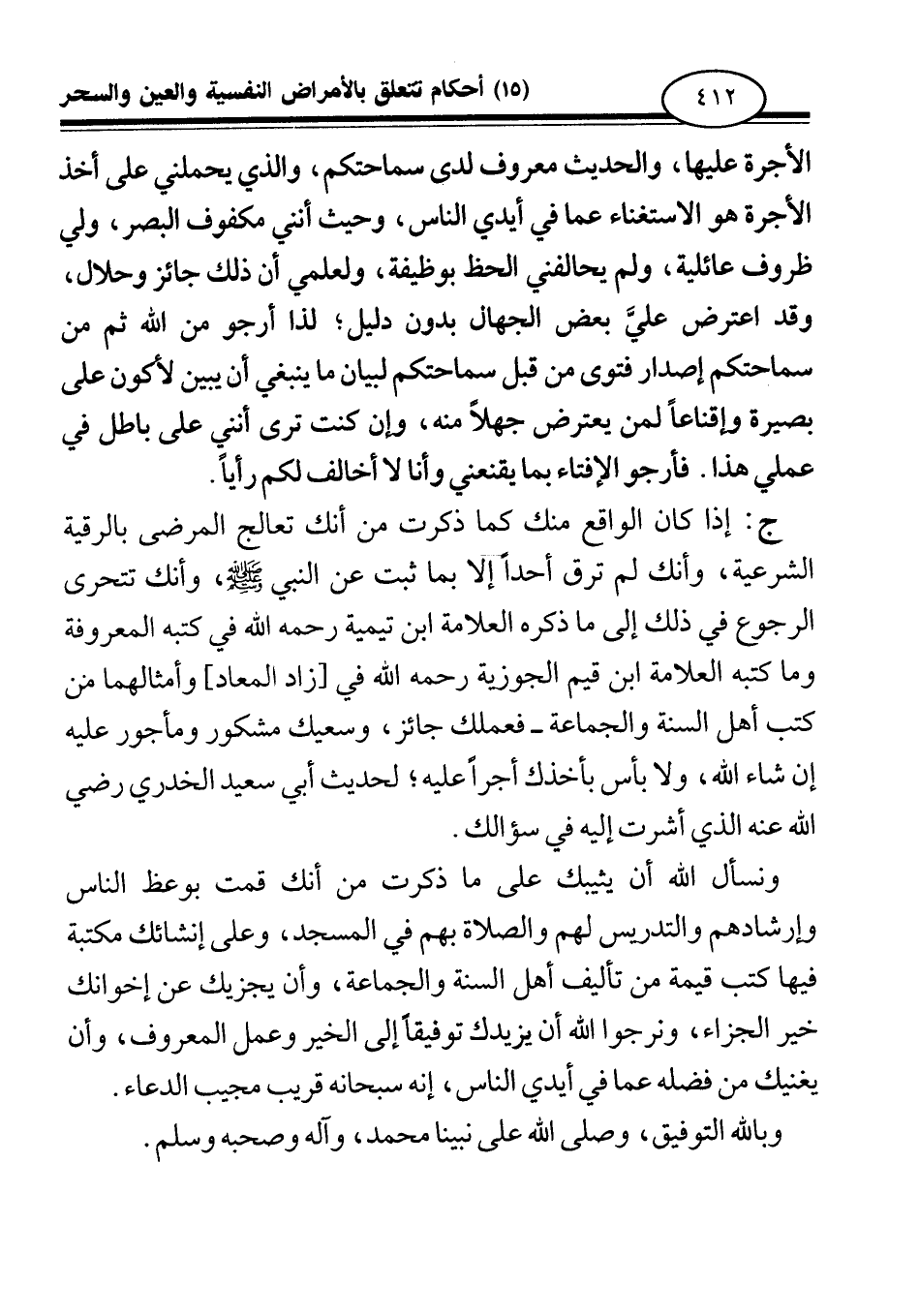 جـ: إذا كان الواقع منك كما ذكرت من أنك تعالج المرضى بالرقية الشرعية وأنك لم ترق أحدا إلا بما ثبت عن النبي صلى الله عليه وسلم، وأنك تتحرى الرجوع في ذلك إلى ما ذكره العلامة ابن تيمية رحمه الله في كتبه المعروفة، وما كتبه العلامة ابن قيم الجوزية رحمه الله في [زاد المعاد] وأمثالهما من كتب أهل السنة والجماعة فعملك جائز، وسعيك مشكور ومأجور عليه إن شاء الله، ولا بأس بأخذك أجرا عليه؛ لحديث أبي سعيد الخدري رضي الله عنه الذي أشرت إليه في سؤالك.