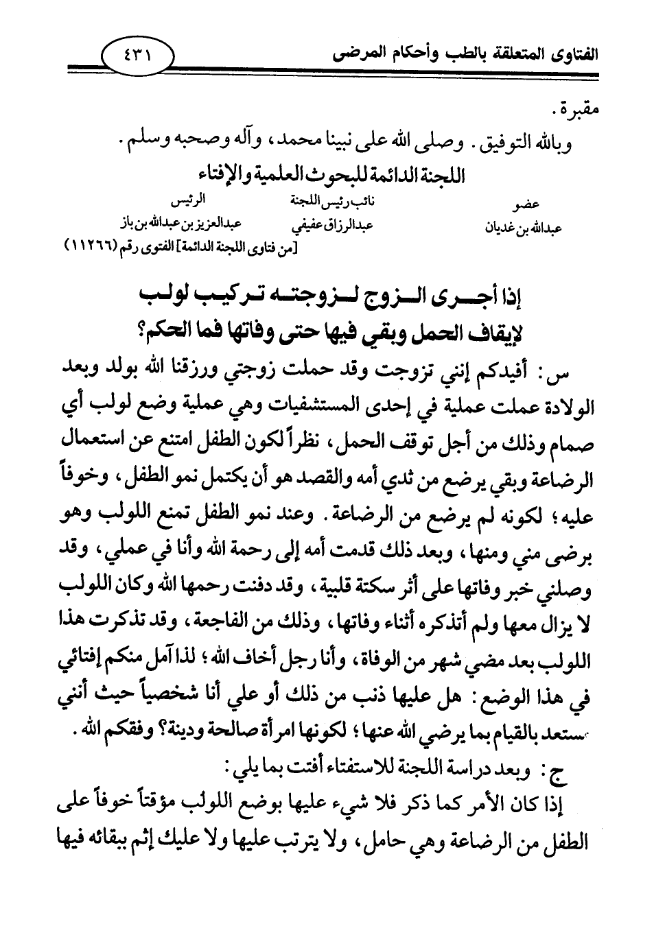 ج: إذا كان الأمر كما ذكر، فلا شيء عليها بوضع اللولب مؤقتا خوفا على الطفل من الرضاعة وهي حامل، ولا يترتب عليها ولا عليك إثم ببقائه فيها