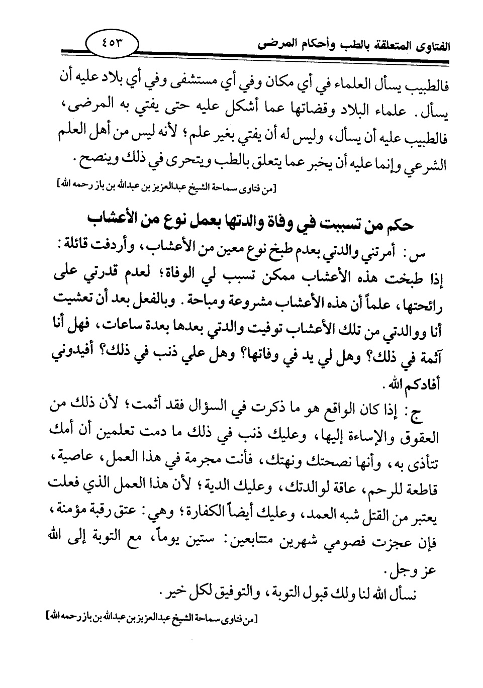 فالطبيب يسأل العلماء في أي مكان، وفي أي مستشفى، وفي أي بلاد، عليه أن يسأل علماء البلاد وقضاتها عما أشكل عليه حتى يفتي به المرضى، فالطبيب عليه أن يسأل، وليس له أن يفتي بغير علم، لأنه ليس من أهل العلم الشرعي، وإنما عليه أن يخبر عما يتعلق بالطب ويتحرى في ذلك وينصح.
