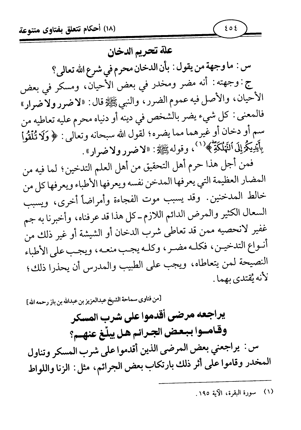 ج: وجهته أنه مضر ومخدر في بعض الأحيان، ومسكر في بعض الأحيان، والأصل فيه عموم الضرر، والنبي صلى الله عليه وسلم قال: «لا ضرر ولا ضرار (¬1) » . فالمعنى: كل شيء يضر بالشخص في دينه أو دنياه محرم عليه تعاطيه من سم أو دخان أو غيرهما مما يضره؛ لقول الله سبحانه وتعالى: {وَلَا تُلْقُوا بِأَيْدِيكُمْ إِلَى التَّهْلُكَةِ} (¬2) وقوله صلى الله عليه وسلم: «لا ضرر ولا ضرار (¬3) » ، فمن أجل هذا حرم أهل التحقيق من أهل العلم التدخين، لما فيه من المضار العظيمة التي يعرفها المدخن نفسه ويعرفها الأطباء ويعرفها كل من خالط المدخنين. وقد يسبب موت الفجاءة وأمراضا أخرى، ويسبب السعال الكثير والمرض الدائم اللازم، كل هذا قد عرفناه وأخبرنا به جم غفير لا نحصيه ممن قد تعاطى شرب الدخان أو الشيشة أو غير ذلك من أنواع التدخين، فكله مضر، وكله يجب منعه، ويجب على الأطباء النصيحة لمن يتعاطاه، ويجب على الطبيب والمدرس أن يحذرا ذلك؛ لأنه يقتدى بهما.
