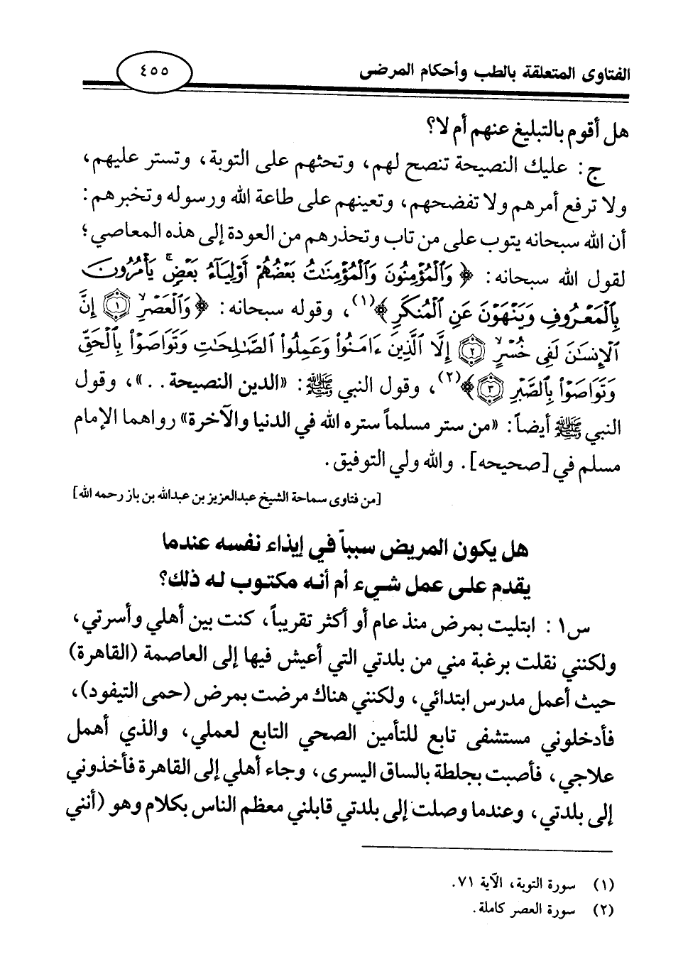 ج: عليك النصيحة، تنصح لهم وتحثهم على التوبة، وتستر عليهم ولا ترفع أمرهم ولا تفضحهم، وتعينهم على طاعة الله ورسوله، وتخبرهم أن الله سبحانه يتوب على من تاب، وتحذرهم من العودة إلى هذه المعاصي؛ لقول الله سبحانه: {وَالْمُؤْمِنُونَ وَالْمُؤْمِنَاتُ بَعْضُهُمْ أَوْلِيَاءُ بَعْضٍ يَأْمُرُونَ بِالْمَعْرُوفِ وَيَنْهَوْنَ عَنِ الْمُنْكَرِ} (¬1) وقوله سبحانه: {وَالْعَصْرِ} (¬2) {إِنَّ الْإِنْسَانَ لَفِي خُسْرٍ} (¬3) {إِلَّا الَّذِينَ آمَنُوا وَعَمِلُوا الصَّالِحَاتِ وَتَوَاصَوْا بِالْحَقِّ وَتَوَاصَوْا بِالصَّبْرِ} (¬4) وقول النبي صلى الله عليه وسلم: «الدين النصيحة (¬5) » وقول النبي صلى الله عليه وسلم عليه وسلم أيضا: «من ستر مسلما ستره الله في الدنيا والآخرة (¬6) » رواهما الإمام مسلم في صحيحه، والله ولي التوفيق.