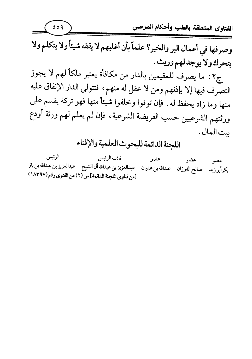 ج2: ما يصرف للمقيمين بالدار من مكافأة تعتبر ملكا لهم، لا يجوز التصرف فيها إلا بإذنهم، ومن لا عقل له منهم فتتولى الدار الإنفاق عليه منها، وما زاد يحفظ له. فإن توفوا وخلفوا شيئا منها فهو تركة يقسم على ورثتهم الشرعيين حسب الفريضة الشرعية، فإن لم يعلم لهم ورثة أودع بيت المال.