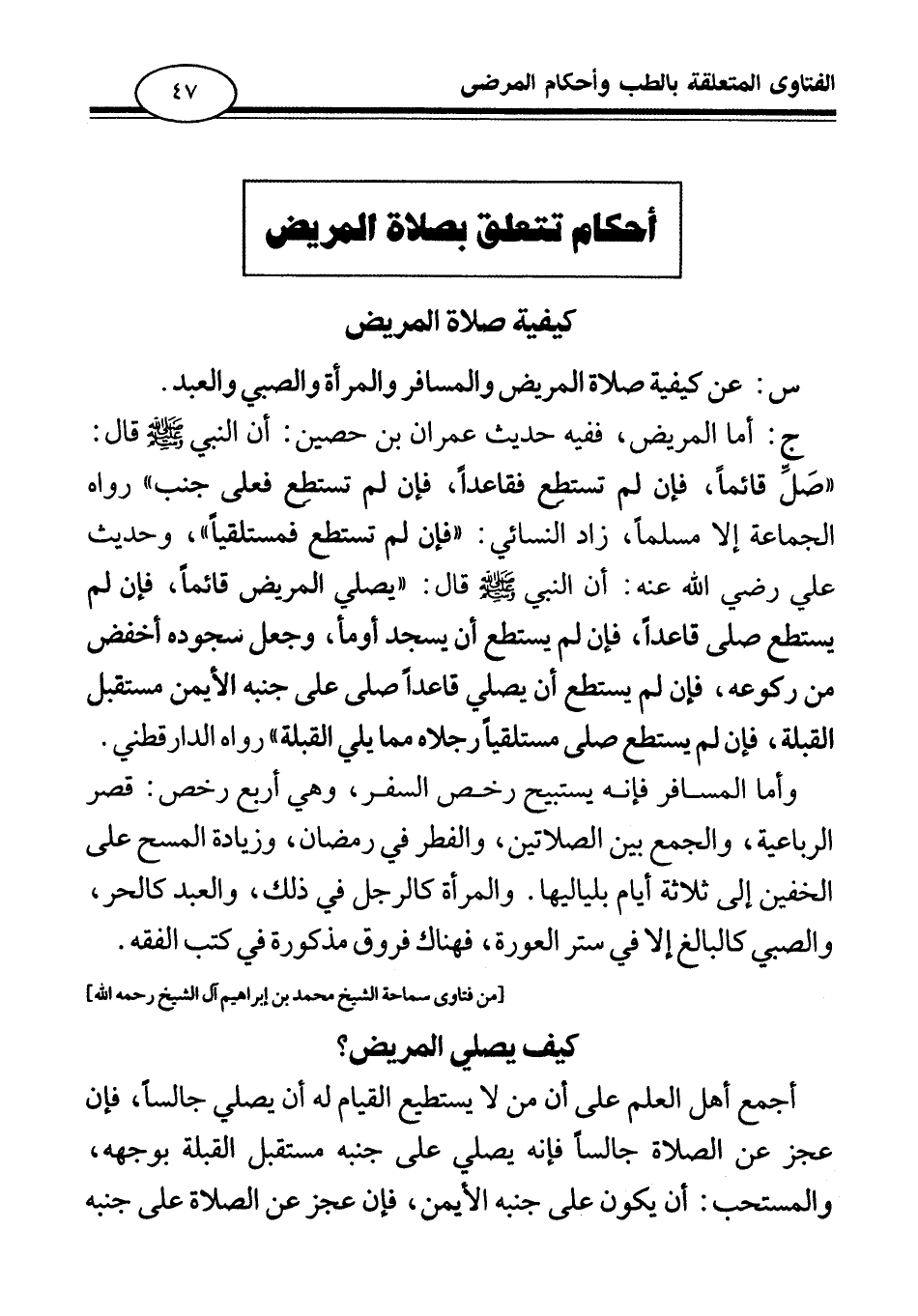 س: عن كيفية صلاة المريض والمسافر والمرأة والصبي والعبد.