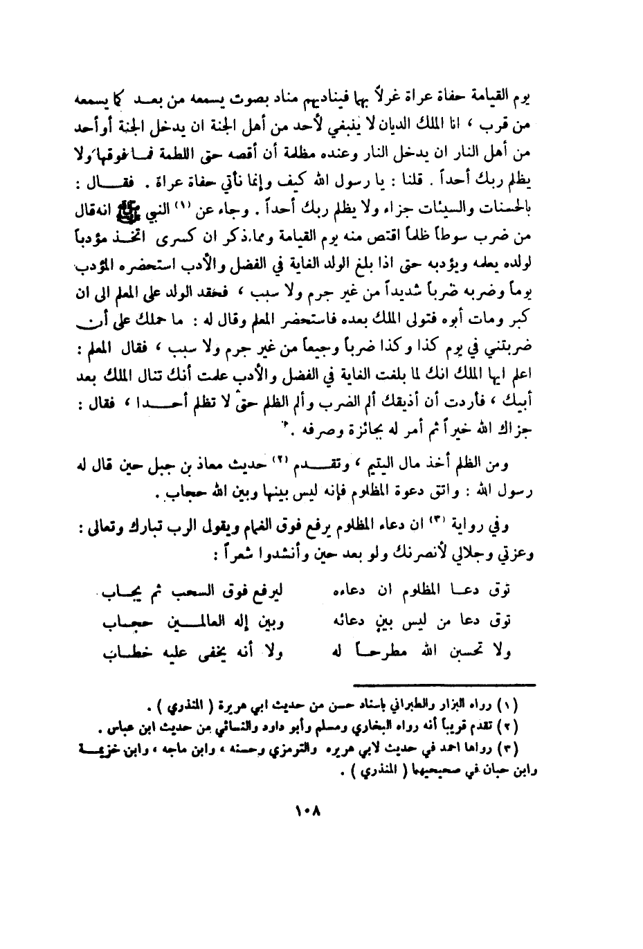 يَوْم الْقِيَامَة حُفَاة عُرَاة غزلا بهما فيناديهم مُنَاد بِصَوْت يسمعهُ من بعد كَمَا يسمعهُ من قرب أَنا الْملك الديَّان لَا يَنْبَغِي لأحد من أهل الْجنَّة أَن يدْخل الْجنَّة أَو أحد من أهل النَّار أَن يدْخل النَّار وَعِنْده مظْلمَة أَن أقصه حَتَّى اللَّطْمَة فَمَا فَوْقهَا وَلَا يظلم رَبك أحداً قُلْنَا يَا رَسُول الله كَيفَ وَإِنَّمَا نأتي حُفَاة عُرَاة فَقَالَ بِالْحَسَنَاتِ والسيئات جَزَاء وَلَا يظلم رَبك أحداً وَجَاء عَن النَّبِي صلى الله عَلَيْهِ وَسلم أَنه قَالَ من ضرب سَوْطًا ظلما اقْتصّ مِنْهُ يَوْم الْقِيَامَة وَمِمَّا ذكر أَن كسْرَى اتخذ مؤدباً لوَلَده يُعلمهُ ويؤدبه حَتَّى إِذا بلغ الْوَلَد الْغَايَة فِي الْفضل وَالْأَدب استحضره الْمُؤَدب يَوْمًا وضربه ضرباً شَدِيدا من غير جرم وَلَا سَبَب فحقد الْوَلَد على الْمعلم إِلَى أَن كبر وَمَات أَبوهُ فَتَوَلّى الْملك بعده فَاسْتَحْضر الْمعلم وَقَالَ لَهُ مَا حملك على أَن ضربتني فِي يَوْم كَذَا وَكَذَا ضرباً وجيعاً من غير جرم وَلَا سَبَب فَقَالَ الْمعلم اعْلَم أَيهَا الْملك أَنَّك لما بلغت الْغَايَة فِي الْفضل وَالْأَدب علمت أَنَّك تنَال الْملك بعد أَبِيك فَأَرَدْت أَن أذيقك ألم الضَّرْب وألم الظُّلم حَتَّى لَا تظلم أحداً فَقَالَ جَزَاك الله خيراً ثمَّ أَمر لَهُ بجائزة وَصَرفه وَمن الظُّلم أَخذ مَال الْيَتِيم وَتقدم حَدِيث معَاذ بن جبل حِين قَالَ لَهُ رَسُول الله وَاتَّقِ دَعْوَة الْمَظْلُوم فَإِنَّهُ لَيْسَ بَينهَا وَبَين الله حجاب وَفِي رِوَايَة أَن دُعَاء الْمَظْلُوم يرفع فَوق الْغَمَام وَيَقُول الرب تبَارك وَتَعَالَى وَعِزَّتِي وَجَلَالِي لأنصرنك وَلَو بعد حِين وأنشدوا شعراً