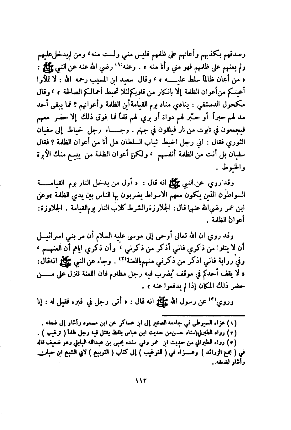 وَصدقهمْ بكذبهم وَأَعَانَهُمْ على ظلمهم فَلَيْسَ مني وَلست مِنْهُ وَمن لم يدْخل عَلَيْهِم وَلم يُعِنْهُمْ على ظلمهم فَهُوَ مني وَأَنا مِنْهُ وَعنهُ رَضِي الله عَنهُ عَن النَّبِي صلى الله عَلَيْهِ وَسلم من أعَان ظَالِما سلط عَلَيْهِ وَقَالَ سعيد بن الْمسيب رَحمَه الله لَا تملأوا أعينكُم من أعوان الظلمَة إِلَّا بإنكار من قُلُوبكُمْ لِئَلَّا تحبط أَعمالكُم الصَّالِحَة وَقَالَ مَكْحُول الدِّمَشْقِي يُنَادي مُنَاد يَوْم الْقِيَامَة أَيْن الظلمَة وأعوانهم فَمَا يبْقى أحد مد لَهُم حبراً أَو حبر لَهُم دَوَاة أَو بري لَهُم قَلما فَمَا فَوق ذَلِك إِلَّا حضر مَعَهم فَيجْمَعُونَ فِي تَابُوت من نَار فيلقون فِي جَهَنَّم وَجَاء رجل خياط إِلَى سُفْيَان الثَّوْريّ فَقَالَ إِنِّي رجل أخيط ثِيَاب السُّلْطَان هَل أَنا من أعوان الظلمَة فَقَالَ سُفْيَان بل أَنْت من الظلمَة أنفسهم وَلَكِن أعوان الظلمَة من يَبِيع مِنْك الإبرة والخيوط وَقد رُوِيَ عَن النَّبِي صلى الله عَلَيْهِ وَسلم أَنه قَالَ أول من يدْخل النَّار يَوْم الْقِيَامَة السواطون الَّذين يكون مَعَهم الأسواط يضْربُونَ بهَا النَّاس بَين يَدي الظلمَة وَعَن ابْن عمر رَضِي الله عَنْهُمَا قَالَ الجلاوزة وَالشّرط كلاب النَّار يَوْم الْقِيَامَة الجلاوزة أعوان الظلمَة وَقد رُوِيَ أَن الله تَعَالَى أوحى إِلَيّ مُوسَى عَلَيْهِ السَّلَام أَن مر بني إسرائيل أَن لَا يَتْلُوا من ذكري فَإِنِّي أذكر من ذَكرنِي وَأَن ذكري إيَّاهُم أَن ألعنهم وَفِي رِوَايَة فَإِنِّي أذكر من ذَكرنِي مِنْهُم باللعنة وَجَاء عَن النَّبِي صلى الله عَلَيْهِ وَسلم أَنه قَالَ لَا يقف أحدكُم فِي موقف يضْرب فِيهِ رجل مظلوم فَإِن اللَّعْنَة تنزل على من حضر ذَلِك الْمَكَان إِذا لم يدفعوا عَنهُ وَرُوِيَ عَن رَسُول الله صلى الله عَلَيْهِ وَسلم أَنه قَالَ أَتَى رجل فِي قَبره فَقيل لَهُ إِنَّا