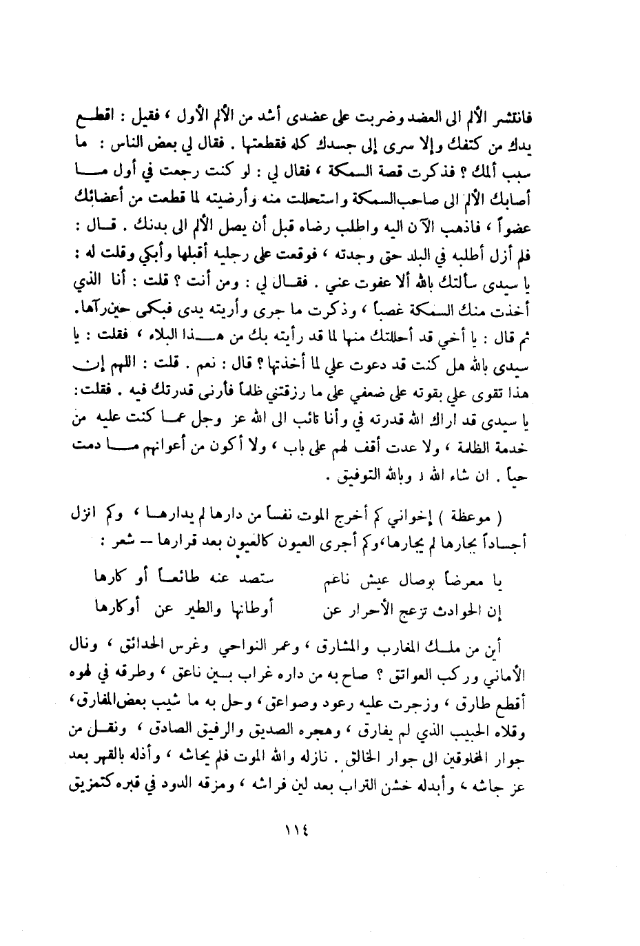 فانتشر الْأَلَم إِلَى الْعَضُد وَضربت على عضدي أَشد من الْأَلَم الأول فَقيل اقْطَعْ يدك من كتفك وَإِلَّا سرى إِلَى جسدك كُله فقطعتها فَقَالَ لي بعض النَّاس مَا سَبَب ألمك فَذكرت قصَّة السَّمَكَة فَقَالَ لي لَو كنت رجعت فِي أول مَا أَصَابَك الْأَلَم إِلَى صَاحب السَّمَكَة واستحللت مِنْهُ وأرضيته لما قطعت من أعضائك عضوا فَاذْهَبْ الْآن إِلَيْهِ واطلب رِضَاهُ قبل أَن يصل الْأَلَم إِلَى بدنك قَالَ فَلم أزل أطلبه فِي الْبَلَد حَتَّى وجدته فَوَقَعت على رجلَيْهِ أقبلها وأبكي وَقلت لَهُ يَا سَيِّدي سَأَلتك بِاللَّه إِلَّا عَفَوْت عني فَقَالَ لي وَمن أَنْت قلت أَنا الَّذِي أخذت مِنْك السَّمَكَة غصباً وَذكرت مَا جرى وأريته يَدي فَبكى حِين رَآهَا ثمَّ قَالَ يَا أخي قد أحللتك مِنْهَا لما قد رَأَيْته بك من هَذَا الْبلَاء فَقلت يَا سَيِّدي بِاللَّه هَل كنت قد دَعَوْت عَليّ لما أَخَذتهَا قَالَ نعم قلت اللَّهُمَّ إِن هَذَا تقوى عَليّ بقوته على ضعْفي على مَا رزقتني ظلما فأرني قدرتك فِيهِ فَقلت يَا سَيِّدي قد أَرَاك الله قدرته فِي وَأَنا تائب إِلَى الله عز وَجل عَمَّا كنت عَلَيْهِ من خدمَة الظلمَة وَلَا عدت أَقف لَهُم على بَاب وَلَا أكون من أعوانهم مَا دمت حَيا إِن شَاءَ الله وَبِاللَّهِ التَّوْفِيق