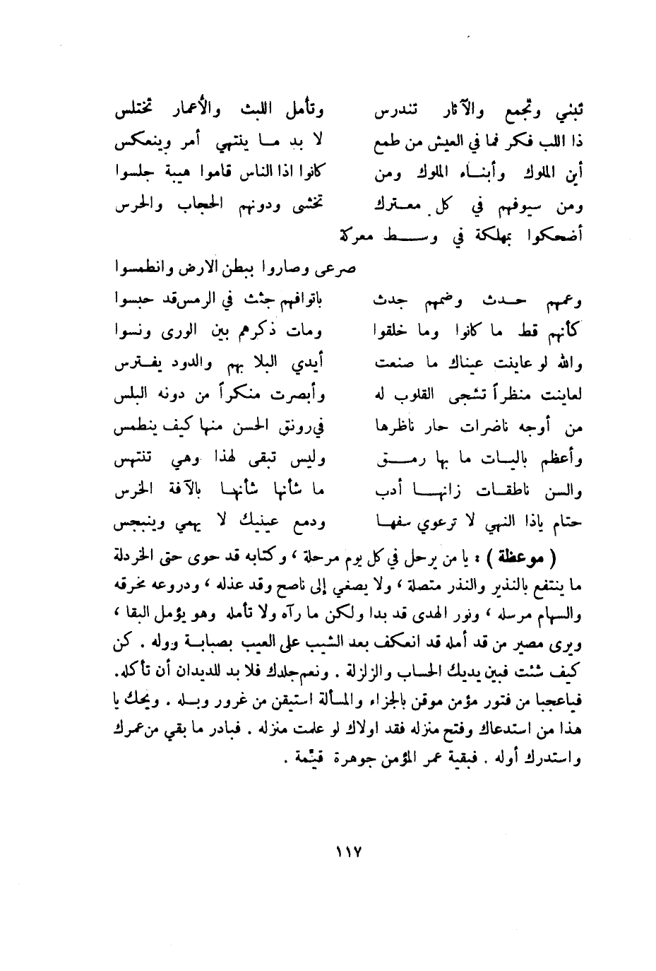 يَا من يرحل فِي كل يَوْم مرحلة وَكتابه قد حوى حَتَّى الخردلة مَا ينْتَفع بالنذير وَالنّذر مُتَّصِلَة وَلَا يصغي إِلَى نَاصح وَقد عذله ودروعه مخرقة والسهام مرسله وَنور الْهدى قد بدا وَلَكِن مَا رَآهُ وَلَا تَأمله وَهُوَ يؤمل البقا وَيرى مصير من قد أمله قد انعكف بعد الشيب على الْعَيْب بصبابة وَوَلِهَ كن كَيفَ شِئْت فَبين يَديك الْحساب والزلزلة وَنعم جِلْدك فَلَا بُد للديدان أَن تَأْكُله فيا عجباً من فتور مُؤمن موقن بالجزاء وَالْمَسْأَلَة استيقن من غرور وبله وَيحك يَا هَذَا من استدعاك وَفتح منزله فقد أولاك لَو علمت منزله فبادر مَا بَقِي من عمرك واستدرك أَوله فبقية عمر الْمُؤمن جَوْهَرَة قيمَة