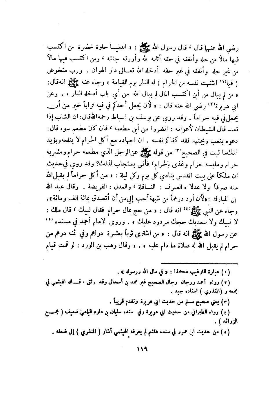 رَضِي الله عَنْهُمَا قَالَ قَالَ رَسُول الله صلى الله عَلَيْهِ وَسلم الدُّنْيَا حلوة خضرَة من اكْتسب فِيهَا مَالا من حله وأنفقه فِي حَقه أثابه الله وأورثه جنته وَمن اكْتسب فِيهَا مَالا من غير حله وأنفقه فِي غير حَقه أدخلهُ الله تَعَالَى دَار الهوان وَرب متخوض (فِيمَا اشتهت نَفسه من الْحَرَام) لَهُ النَّار يَوْم الْقِيَامَة وَجَاء عَنهُ صلى الله عَلَيْهِ وَسلم أَنه قَالَ من لم يبال من أَيْن اكْتسب المَال لم يبال الله من أَي بَاب أدخلهُ النَّار وَعَن أبي هُرَيْرَة رَضِي الله عَنهُ قَالَ لِأَن يَجْعَل أحدكُم فِي فِيهِ تُرَابا خير من أَن يَجْعَل فِي فِيهِ حَرَامًا وَقد رُوِيَ عَن يُوسُف بن أَسْبَاط رَحمَه الله قَالَ أَن الشَّاب إِذا تعبد قَالَ الشَّيْطَان لأعوانه انْظُرُوا من أَيْن مطعمه فَإِن كَانَ مطعم سوء قَالَ دَعوه يتعب ويجتهد فقد كفاكم نَفسه إِن اجهاده مَعَ أكل الْحَرَام لَا يَنْفَعهُ وَيُؤَيّد ذَلِك مَا ثَبت فِي الصَّحِيح من قَوْله صلى الله عَلَيْهِ وَسلم عَن الرجل الَّذِي مطعمه حرَام ومشربه حرَام وملبسه حرَام وغذي بالحرام فَأنى يُسْتَجَاب لذَلِك وَقد رُوِيَ فِي حَدِيث أَن ملكاً على بَيت الْمُقَدّس يُنَادي كل يَوْم وكل لَيْلَة من أكل حَرَامًا لم يقبل الله مِنْهُ صرفاً وَلَا عدلاً الصّرْف النَّافِلَة وَالْعدْل الْفَرِيضَة وَقَالَ عبد الله بن الْمُبَارك لِأَن أرد درهماً من شُبْهَة أحب إِلَيّ من أَن أَتصدق بِمِائَة ألف وَمِائَة وَجَاء عَن النَّبِي صلى الله عَلَيْهِ وَسلم أَنه قَالَ من حج بِمَال حرَام فَقَالَ لبيْك قَالَ ملك لَا لبيْك وَلَا سعديك حجك مَرْدُود عَلَيْك وروى الإِمَام أَحْمد فِي مُسْنده عَن رَسُول الله صلى الله عَلَيْهِ وَسلم أَنه قَالَ من اشْترى ثوبا بِعشْرَة دَرَاهِم وَفِي ثمنه دِرْهَم من حرَام لم يقبل الله لَهُ صَلَاة مَا دَامَ عَلَيْهِ وَقَالَ وهب بن الْورْد لَو قُمْت قيام