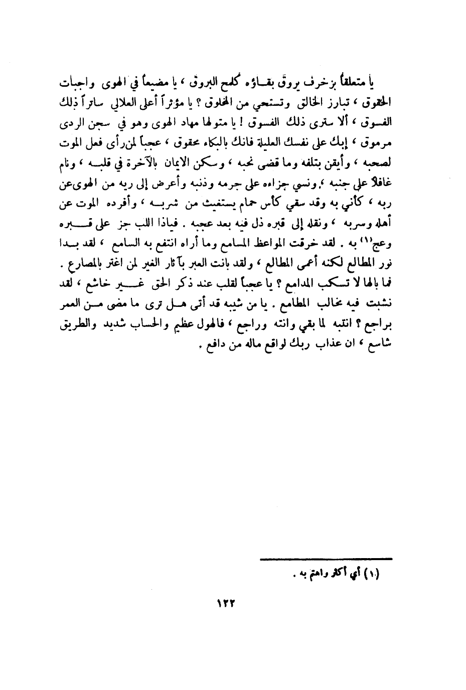 يَا مُتَعَلقا بزخرف يروق بَقَاؤُهُ كلمح البروق يَا مضيعاً فِي الْهوى وَاجِبَات الْحُقُوق تبارز الْخَالِق وتستحي من الْمَخْلُوق يَا مؤثراً أَعلَى العلالي ساتراً ذَلِك الفسوق أَلا سترى ذَلِك الفسوق يَا متولهاً مهاد الْهوى وَهُوَ فِي سجن الردى مرموق إبك على نَفسك العليلة فَإنَّك بالبكاء محقوق عجباً لمن رأى فعل الْمَوْت لصحبه وأيقن بتلفه وَمَا قضى نحبه وَسكن الْإِيمَان بِالآخِرَة فِي قلبه ونام غافلاً على جنبه وَنسي جزءاه على جرمه وذنبه وَأعْرض إِلَى ريه من الْهوى عَن ربه كَأَنِّي بِهِ وَقد سقِِي كأس حمام يستغيث من شربه وأفرده الْمَوْت عَن أَهله وسربه وَنَقله إِلَى قَبره ذل فِيهِ بعد عجبه فياذا اللب جز على قَبره وعج بِهِ لقد خرقت المواعظ المسامع وَمَا أرَاهُ انْتفع بِهِ السَّامع لقد بدا نور الْمطَالع لكنه أعمى الْمطَالع وَلَقَد بَانَتْ العبر بآثار الْغَيْر لمن اغْترَّ بالمصارع فَمَا بالها لَا تسكب المدامع يَا عجباً لقلب عِنْد ذكر الْحق غير خاشع لقد نشبت فِيهِ مخالب المطامع يَا من شَيْبه قد أَتَى هَل ترى مَا مضى من الْعُمر براجع انتبه لما بَقِي وانته وراجع فالهول عَظِيم والحساب شَدِيد وَالطَّرِيق شاسع إِن عَذَاب رَبك لوَاقِع مَاله من دَافع