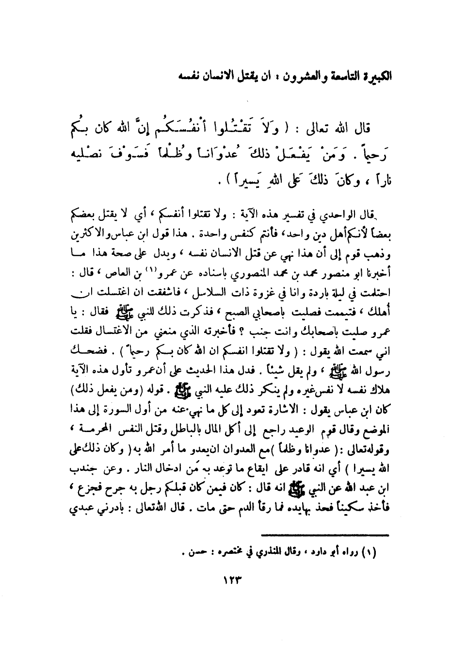 قَالَ الله تَعَالَى {وَلَا تقتلُوا أَنفسكُم إِن الله كَانَ بكم رحِيما وَمن يفعل ذَلِك عُدْوانًا وظلماً فَسَوف نصليه نَارا وَكَانَ ذَلِك على الله يَسِيرا} قَالَ الواحدي فِي تَفْسِير هَذِه الْآيَة ولاتقتلوا أَنفسكُم أَي لَا يقتل بَعْضكُم بَعْضًا لأنكم أهل دين وَاحِد فَأنْتم كَنَفس وَاحِدَة هَذَا قَول ابْن عَبَّاس والأكثرين وَذهب قوم إِلَى أَن هَذَا نهي عَن قتل الْإِنْسَان نَفسه وَيدل على صِحَة هَذَا مَا أخبرنَا أَبُو مَنْصُور مُحَمَّد بن مُحَمَّد المنصوري بِإِسْنَادِهِ عَن عَمْرو بن الْعَاصِ قَالَ احْتَلَمت فِي لَيْلَة بَارِدَة وَأَنا فِي غَزْوَة ذَات السلَاسِل فَأَشْفَقت إِن اغْتَسَلت أَن أهلك فَتَيَمَّمت فَصليت بِأَصْحَابِي الصُّبْح فَذكرت ذَلِك للنَّبِي صلى الله عَلَيْهِ وَسلم فَقَالَ يَا عَمْرو صليت بِأَصْحَابِك وَأَنت جنب فَأَخْبَرته الَّذِي مَنَعَنِي من الاغتسال فَقلت أَنِّي سَمِعت الله يَقُول وَلَا تقتلُوا أَنفسكُم إِن الله كَانَ بكم رحِيما فَضَحِك رَسُول الله صلى الله عَلَيْهِ وَسلم وَلم يقل شَيْئا فَدلَّ هَذَا الحَدِيث على أَن عَمْرو تَأَول هَذِه الْآيَة هَلَاك نَفسه لَا نفس غَيره وَلم يُنكر ذَلِك عَلَيْهِ النَّبِي صلى الله عَلَيْهِ وَسلم قَوْله وَمن يفعل ذَلِك كَانَ ابْن عَبَّاس يَقُول الْإِشَارَة تعود إِلَى كل مَا نهي عَنهُ من أول السُّورَة إِلَى هَذَا الْموضع وَقَالَ قوم الْوَعيد رَاجع إِلَى أكل المَال بِالْبَاطِلِ وَقتل النَّفس الْمُحرمَة وَقَوله تَعَالَى {عُدْوانًا وظلماً} مَعَ الْعدوان أَن يعدو مَا أَمر الله بِهِ وَكَانَ ذَلِك على الله يَسِيرا أَي أَنه قَادر على إِيقَاع مَا توعد بِهِ من إِدْخَال النَّار وَعَن جُنْدُب بن عبد الله عَن النَّبِي صلى الله عَلَيْهِ وَسلم أَنه قَالَ كَانَ فِيمَن كَانَ قبلكُمْ رجل بِهِ جرح فجزع فَأخذ سكيناً فحذ بهَا يَده فَمَا رقأالدم حَتَّى مَاتَ قَالَ الله تَعَالَى بادرني عَبدِي