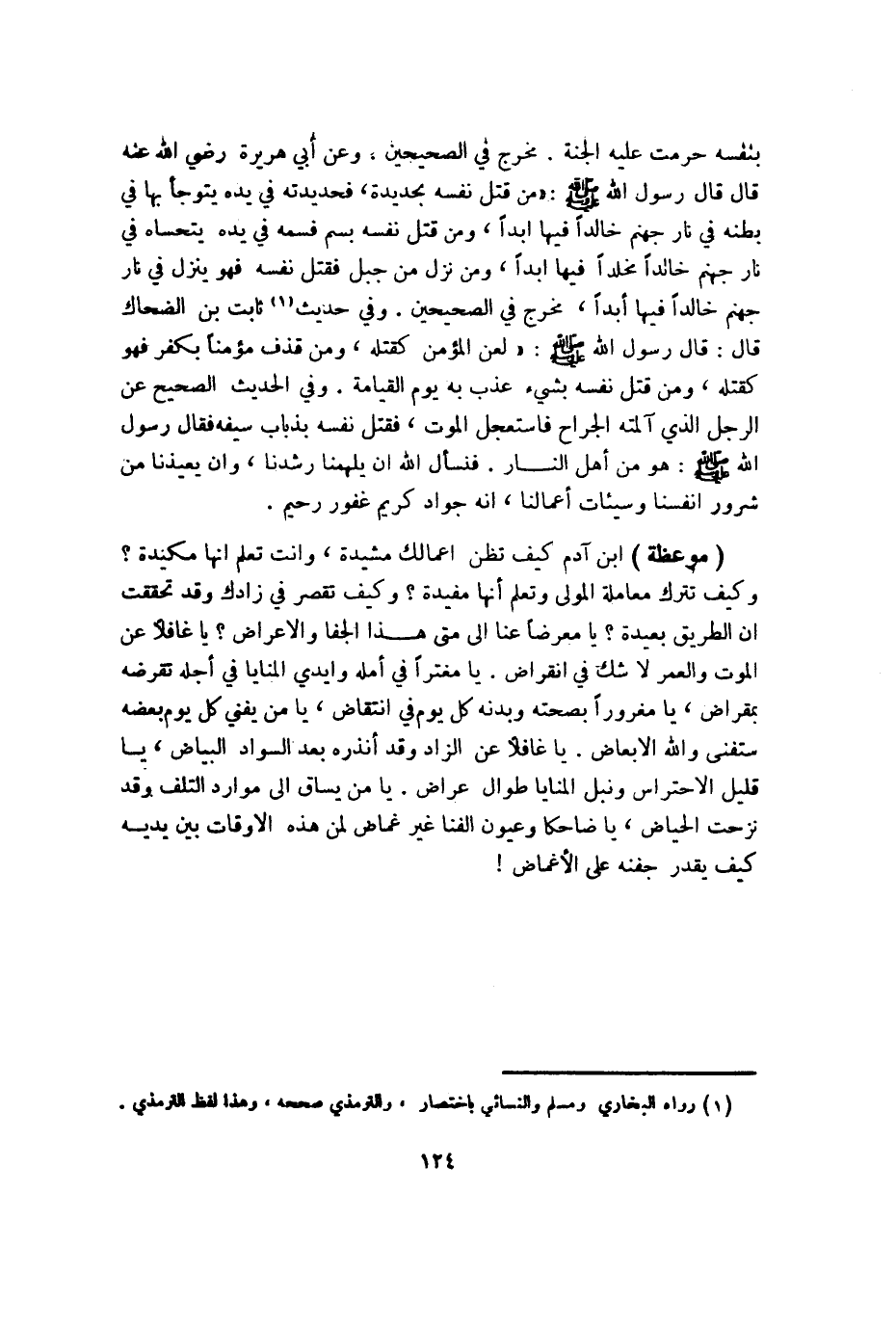 بِنَفسِهِ حرمت عَلَيْهِ الْجنَّة مخرج فِي الصَّحِيحَيْنِ وَعَن أبي هُرَيْرَة رَضِي الله عَنهُ قَالَ قَالَ رَسُول الله صلى الله عَلَيْهِ وَسلم من قتل نَفسه بحديدة فحديدته فِي يَده يتوجأ بهَا فِي بَطْنه فِي نَار جَهَنَّم خَالِدا فِيهَا أبداً وَمن قتل نَفسه بِسم فسمه فِي يَده يتحساه فِي نَار جَهَنَّم خَالِدا مخلداً فِيهَا أبداً وَمن نزل من جبل فَقتل نَفسه فَهُوَ ينزل فِي نَار جَهَنَّم خَالِدا فِيهَا أبداً مخرج فِي الصَّحِيحَيْنِ وَفِي حَدِيث ثَابت بن الضَّحَّاك قَالَ قَالَ رَسُول الله صلى الله عَلَيْهِ وَسلم لعن الْمُؤمن كقتله وَمن قذف مُؤمنا بِكفْر فَهُوَ كقتله وَمن قتل نَفسه بِشَيْء عذب بِهِ يَوْم الْقِيَامَة وَفِي الحَدِيث الصَّحِيح عَن الرجل الَّذِي آلمته الْجراح فاستعجل الْمَوْت فَقتل نَفسه بذباب سَيْفه فَقَالَ رَسُول الله صلى الله عَلَيْهِ وَسلم هُوَ من أهل النَّار فنسأل الله أَن يلهمنا رشدنا وَأَن يعيذنا من شرور أَنْفُسنَا وسيئات أَعمالنَا إِنَّه جواد كريم غَفُور رَحِيم