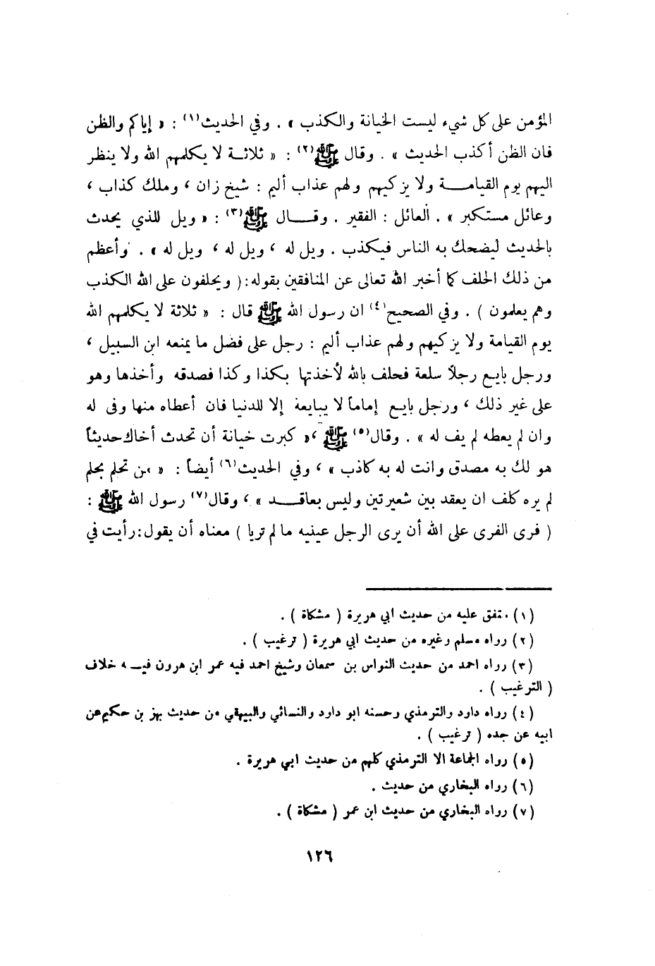 الْمُؤمن على كل شَيْء لَيست الْخِيَانَة وَالْكذب وَفِي الحَدِيث إيَّاكُمْ وَالظَّن فَإِن الظَّن أكذب الحَدِيث وَقَالَ صلى الله عَلَيْهِ وَسلم ثَلَاثَة لَا يكلمهم الله وَلَا ينظر إِلَيْهِم يَوْم الْقِيَامَة وَلَا يزكيهم وَلَهُم عَذَاب أَلِيم شيخ زَان وَملك كَذَّاب وعائل مستكبر العائل الْفَقِير وَقَالَ صلى الله عَلَيْهِ وَسلم ويل للَّذي يحدث بِالْحَدِيثِ ليضحك بِهِ النَّاس فيكذب ويل لَهُ ويل لَهُ ويل لَهُ وَأعظم من ذَلِك الْحلف كَمَا أخبر الله تَعَالَى عَن الْمُنَافِقين بقوله ويحلفون على الله الْكَذِب وهم يعلمُونَ وَفِي الصَّحِيح أَن رَسُول الله صلى الله عَلَيْهِ وَسلم قَالَ ثَلَاثَة لَا يكلمهم الله يَوْم الْقِيَامَة وَلَا يزكيهم وَلَهُم عَذَاب أَلِيم رجل على فضل مَا يمنعهُ ابْن السَّبِيل وَرجل بَايع رجلاً سلْعَة فَحلف بِاللَّه لأخذتها بِكَذَا وَكَذَا فَصدقهُ وَأَخذهَا وَهُوَ على غير ذَلِك وَرجل بَايع إِمَامًا لَا يبايعه إِلَّا للدنيا فَإِن أعطَاهُ مِنْهَا وفى لَهُ وَإِن لم يُعْطه لم يَفِ لَهُ وَقَالَ صلى الله عَلَيْهِ وَسلم كَبرت خِيَانَة أَن تحدث أَخَاك حَدِيثا هُوَ لَك بِهِ مُصدق وَأَنت لَهُ بِهِ كَاذِب وَفِي الحَدِيث أَيْضا من تحلم بحلم لم يره كلف أَن يعْقد بَين شعيرتين وَلَيْسَ بعاقد وَقَالَ رَسُول الله صلى الله عَلَيْهِ وَسلم (فرى الفرى على الله أَن يري الرجل عَيْنَيْهِ مَا لم تريا) مَعْنَاهُ أَن يَقُول رَأَيْت فِي