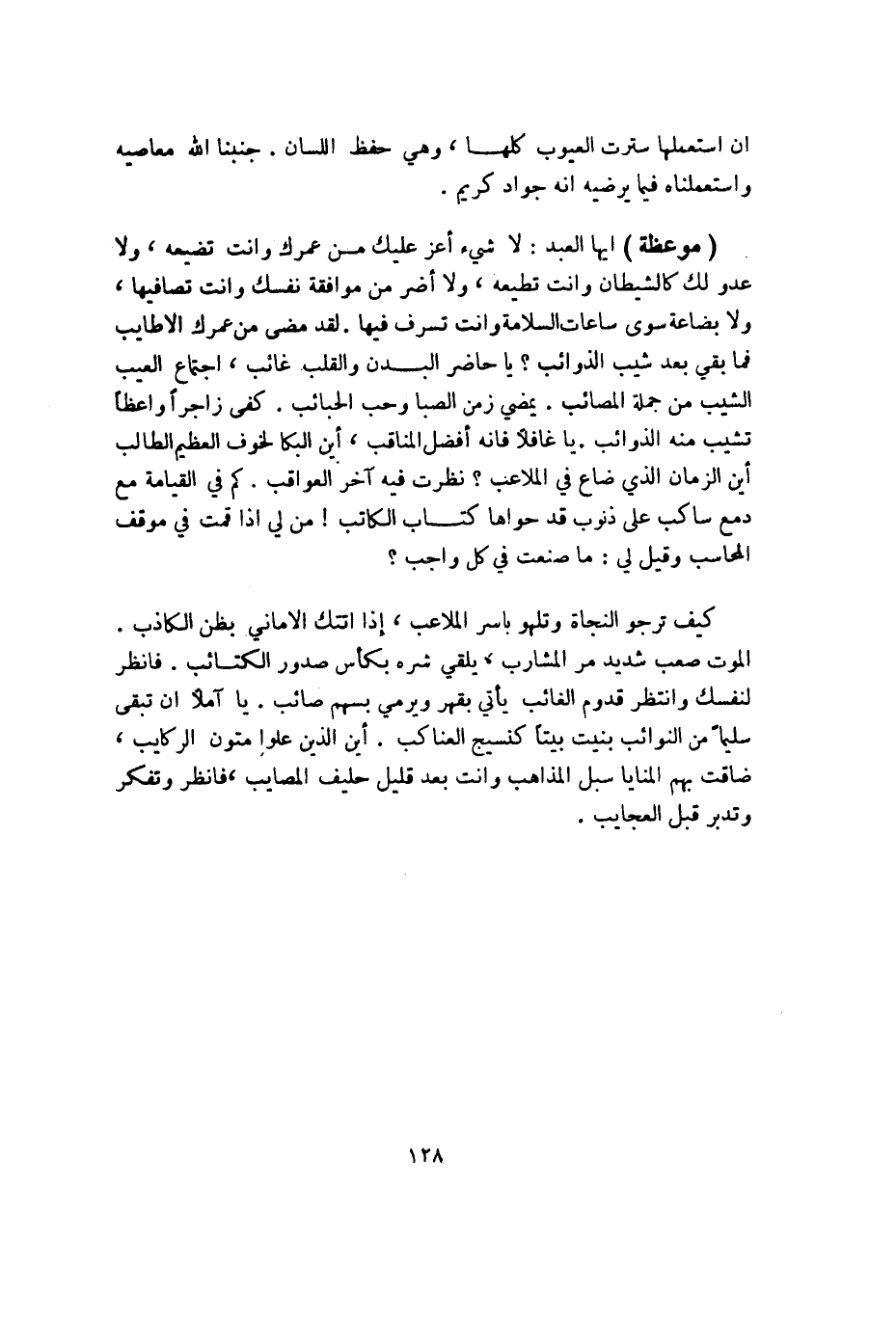 أَيهَا العَبْد لَا شَيْء أعز عَلَيْك من عمرك وَأَنت تضيعه وَلَا عَدو لَك كالشيطان وَأَنت تُطِيعهُ وَلَا أضر من مُوَافقَة نَفسك وَأَنت تصافيها وَلَا بضَاعَة سوى سَاعَات السَّلامَة وَأَنت تسرف فِيهَا لقد مضى من عمرك الأطايب فَمَا بَقِي بعد شيب الذوائب يَا حَاضر الْبدن وَالْقلب غَائِب اجْتِمَاع الْعَيْب الشيب من جملَة المصائب يمْضِي زمن الصِّبَا وَحب الحبائب كفى زاجراً واعظاً تشيب مِنْهُ الذوائب يَا غافلاً فَإِنَّهُ أفضل المناقب أَيْن البكا لخوف الْعَظِيم الطَّالِب أَيْن الزَّمَان الَّذِي ضَاعَ فِي الملاعب نظرت فِيهِ آخر العواقب كم فِي الْقِيَامَة مَعَ دمع ساكب على ذنُوب قد حواها كتاب الْكَاتِب من لي إِذا قُمْت فِي موقف المحاسب وَقيل لي مَا صنعت فِي كل وَاجِب كَيفَ ترجو النجَاة وتلهو بأسر الملاعب إِذا أتتك الْأَمَانِي بِظَنّ الْكَاذِب الْمَوْت صَعب شَدِيد مر المشارب يلقِي شَره بكأس صُدُور الْكَتَائِب فَانْظُر لنَفسك وانتظر قدوم الْغَائِب يَأْتِي بقهر وَيَرْمِي بِسَهْم صائب يَا آملاً أَن تبقى سليماً من النوائب بنيت بَيْتا كنسيج العناكب أَيْن الَّذين علوا متون الركايب ضَاقَتْ بهم المنايا سبل الْمذَاهب وَأَنت بعد قَلِيل حَلِيف المصايب فَانْظُر وتفكر وتدبر قبل العجايب