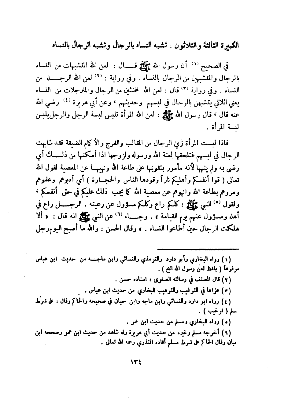 الْكَبِيرَة الثَّالِثَة وَالثَّلَاثُونَ تشبه النِّسَاء بِالرِّجَالِ وتشبه الرِّجَال بِالنسَاء