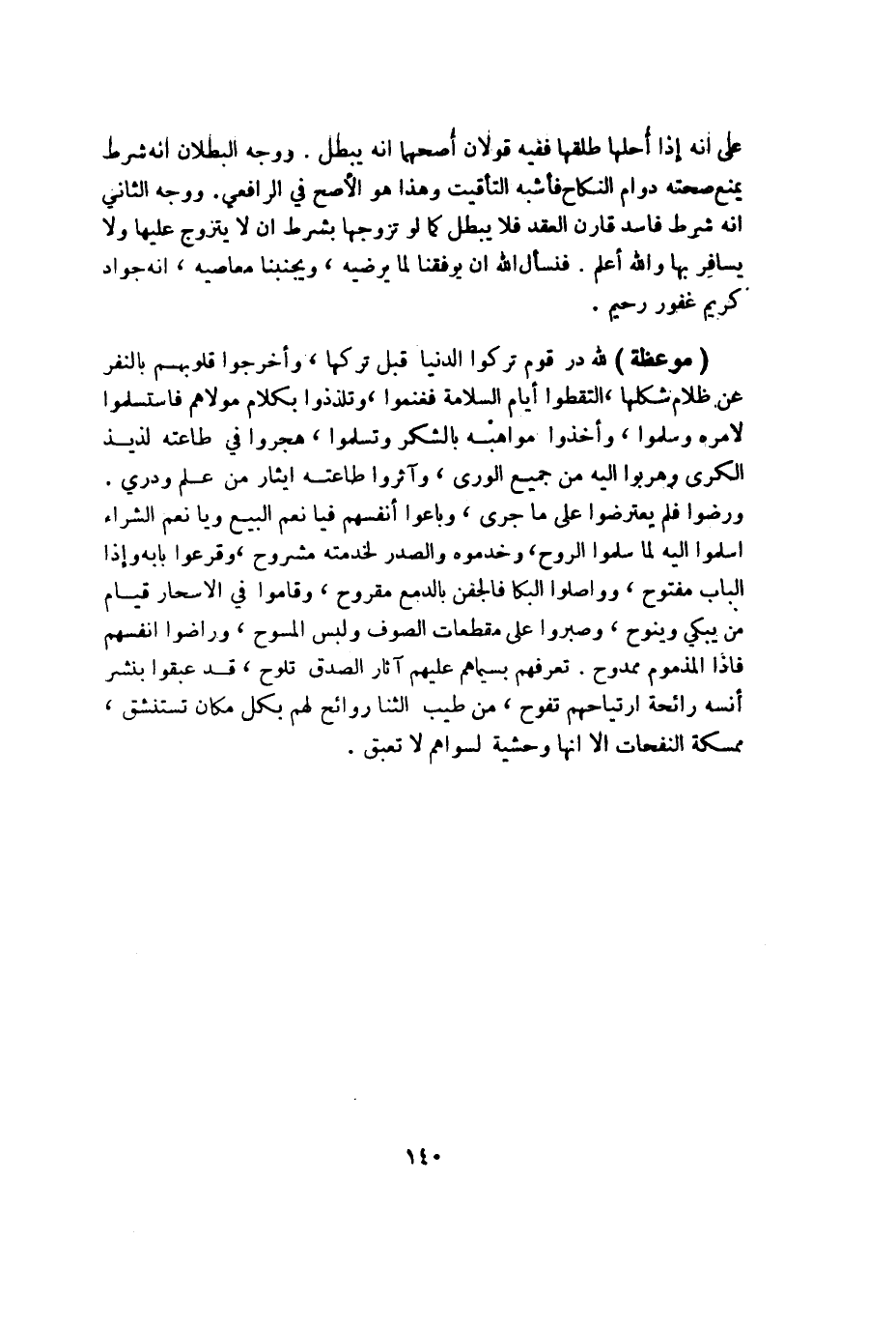 لله در قوم تركُوا الدُّنْيَا قبل تَركهَا وأخرجوا قُلُوبهم بالنفر عَن ظلام شكلها التقطوا أَيَّام السَّلامَة فغنموا وتلذذوا بِكَلَام مَوْلَاهُم فاستسلموا لأَمره وسلموا وَأخذُوا مواهبه بالشكر وتسلموا هجروا فِي طَاعَته لذيذ الْكرَى وهربوا إِلَيْهِ من جَمِيع الورى وآثروا طَاعَته إيثار من علم ودري وَرَضوا فَلم يعترضوا على مَا جرى وَبَاعُوا أنفسهم فيا نعم البيع وَيَا نعم الشِّرَاء أَسْلمُوا إِلَيْهِ لما سلمُوا الروح وخدموه والصدر لخدمته مَشْرُوع وقرعوا بَابه وَإِذا الْبَاب مَفْتُوح وواصلوا الْبكاء فالجفن بالدمع مقروح وَقَامُوا فِي الأسحار قيام من يبكي وينوح وصبروا على مقطعات الصُّوف وَلبس المسوح وراضوا أنفسهم فَإِذا المذموم ممدوح تعرفهم بِسِيمَاهُمْ عَلَيْهِم آثَار الصدْق تلوح قد عبقوا بنشر أنسه رَائِحَة ارتياحهم تفوح من طيب الثنا رَوَائِح لَهُم بِكُل مَكَان تستنشق ممسكة النفحات إِلَّا أَنَّهَا وحشية لسواهم لَا تعبق